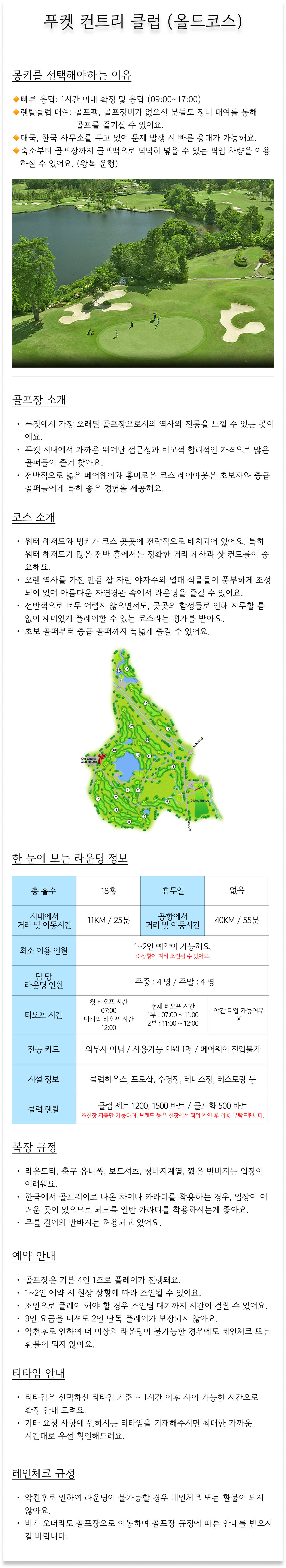 💲 캐디팁 - 태국의 골프장은 캐디피와 별도로 캐디팁을 반드시 지불해야해요. - 캐디팁은 골프장에 따라 조금씩 다르나, 18홀 당 500바트 이상의 캐디팁을 권장해요. - 캐디팁은 라운딩 종료 후 캐디에게 직접 지불해주시면 돼요. ❗ 기타 유의사항 - 부득이하게 추가 금액이 발생 되는 경우, 예약 진행 시 사전 안내 드립니다. - 개별 여행자 보험 가입을 권장 드려요. - 토, 일요일 및 태국 공휴일에는 주말 요금이 적용돼요. - 현금 및 귀중품 분실과 개인 안전 사고에 유의해주세요. - 외부에서 구입한 음료 및 음식물은 필드로 반입이 불가능해요. 라운딩 전 적발 시 : 음식 및 음료 제외한 후 라운딩 시작 혹은 심한 경우에는 티오프 불가 (환불 불가) 라운딩 중 적발 시 : 라운딩 진행 불가 및 퇴장 조치 (환불 불가)