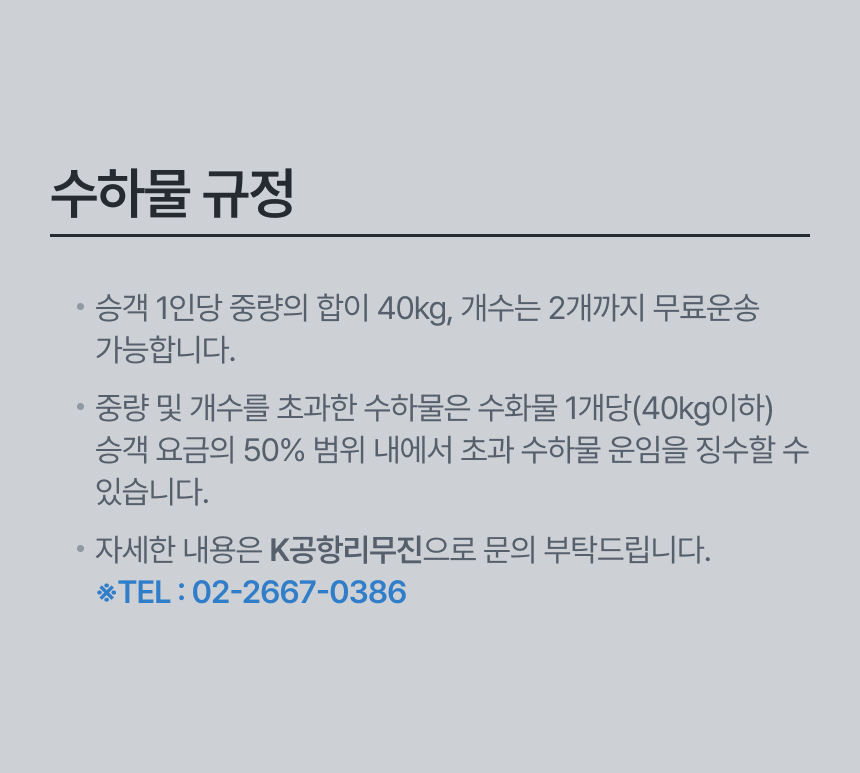 [사용방법] ※ 이용권을 구매하시면 알림톡 또는 이메일로 이용권이 발송됩니다. ※ 수신된 메시지에서 [이용권 보기]를 클릭하면 이용권 상세 화면이 나옵니다. ※ 리무진 탑승 전, K공항 리무진을 확인해주세요. ※ 기사님이 있을 때, 단말기에 승차권의 QR코드를 인식시켜 주세요. ※ "정상 승인되었습니다" 안내 멘트와 함께 탑승이 가능합니다. [소아 동반 탑승 규정] ※ 승차권을 구입한 성인 1인당 만 6세 미만 소아 1인 무료 탑승 가능합니다. ※ 성인과 함께 1좌석 배정되며, 잔여석이 있을 경우 2좌석 가능합니다. [수하물 규정] ※ 유료 승객 1인당 중량의 합이 40kg 및 개수의 합이 2개까지 무임으로 운송됩니다. ※ 중량 및 개수를 초과한 수하물은 수하물 1개당(40kg이하) 승객요금의 50% 범위 내에서 초과 수하물 운임으로 징수할 수 있습니다. ※ 자세한 내용은 'K공항리무진'으로 문의 부탁드립니다. ※ 문의 : 02-2667-0386