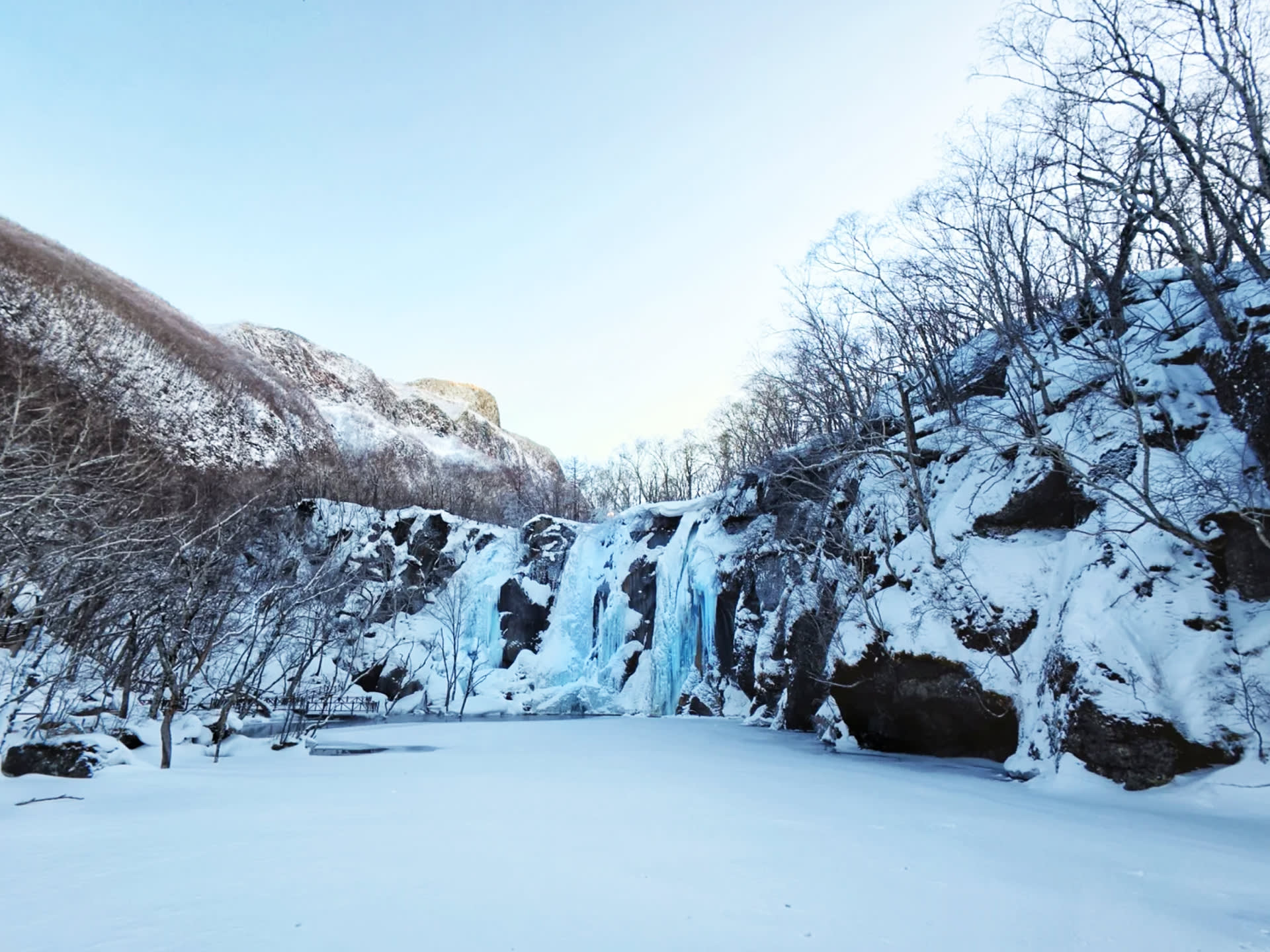 💧 뤼위안탄・선경 속 물빛 얼지 않았을 때는 깊고 푸른 물빛을 띠고, 사방이 자작나무 숲으로 둘러싸여 있으며 폭포가 높은 곳에서 연못으로 떨어져 아름다운 경치를 자랑합니다. 겨울에는 장관을 이루는 빙벽이 형성됩니다.