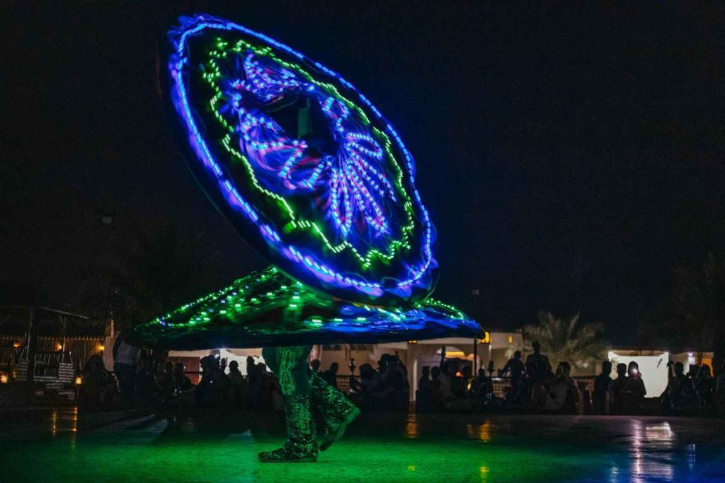 벨리댄스 쇼나 타누라 쇼의 빙글빙글 도는 댄서들과 같은 아랍 전통 공연을 관람해 보세요. 시샤 물담배를 피워보세요. 사막 한가운데서 정통 아랍 요리로 구성된 바비큐 뷔페 저녁 식사를 즐겨보세요. 두바이의 숙소로 돌아갑니다.