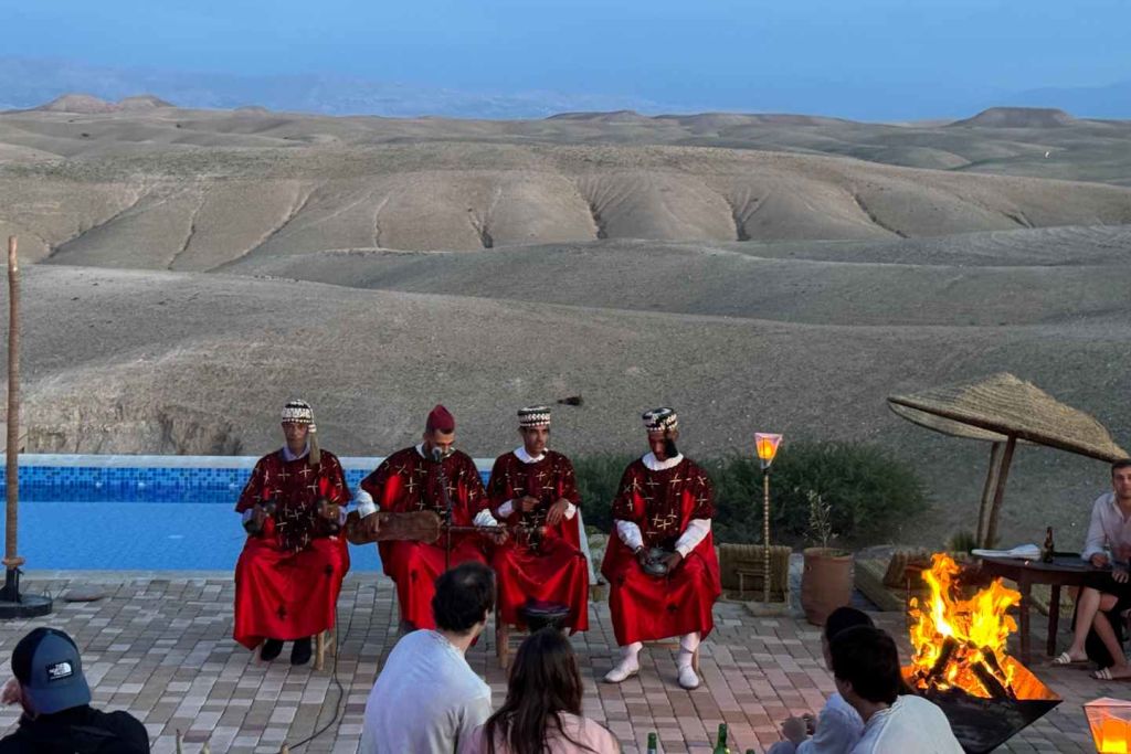 나중에 캠프파이어 주위에 모여 샐러드, 치킨 타진, 야채 쿠스쿠스, 디저트로 구성된 맛있는 모로코 저녁 식사를 즐기세요. 배꼽춤과 그나와 음악의 전통 공연을 즐기며, 불을 삼키는 퍼포먼스도 감상할 수 있습니다.