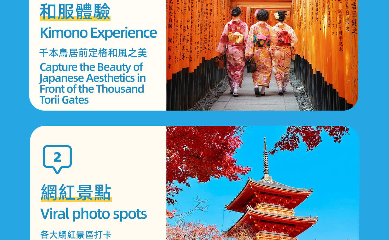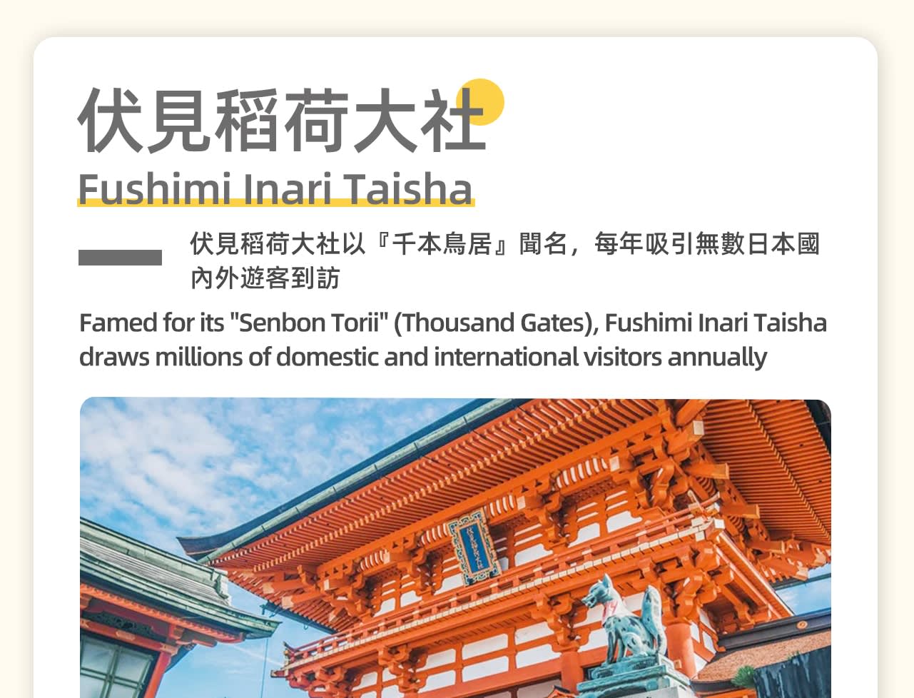 * 세 번째 코스: ⛩️후시미 이나리 신사는 '센본도리이'로 유명하며 매년 수많은 일본 국내외 관광객이 방문하고 있으며, 3년 연속 세계 최대 여행 웹사이트 조사에서 '외국인에게 가장 인기 있는 일본 관광지' 1위를 차지했습니다. 🎉각각의 매력이 넘치는 이 관광지들은 교토 세계 유산 당일 투어를 구성합니다. 자연 경관과 문화 체험 모두 잊지 못할 추억을 선사할 것입니다. 지금 바로 저희와 함께 교토의 매력을 탐험하고 이 즐거움을 함께 나누세요🎉