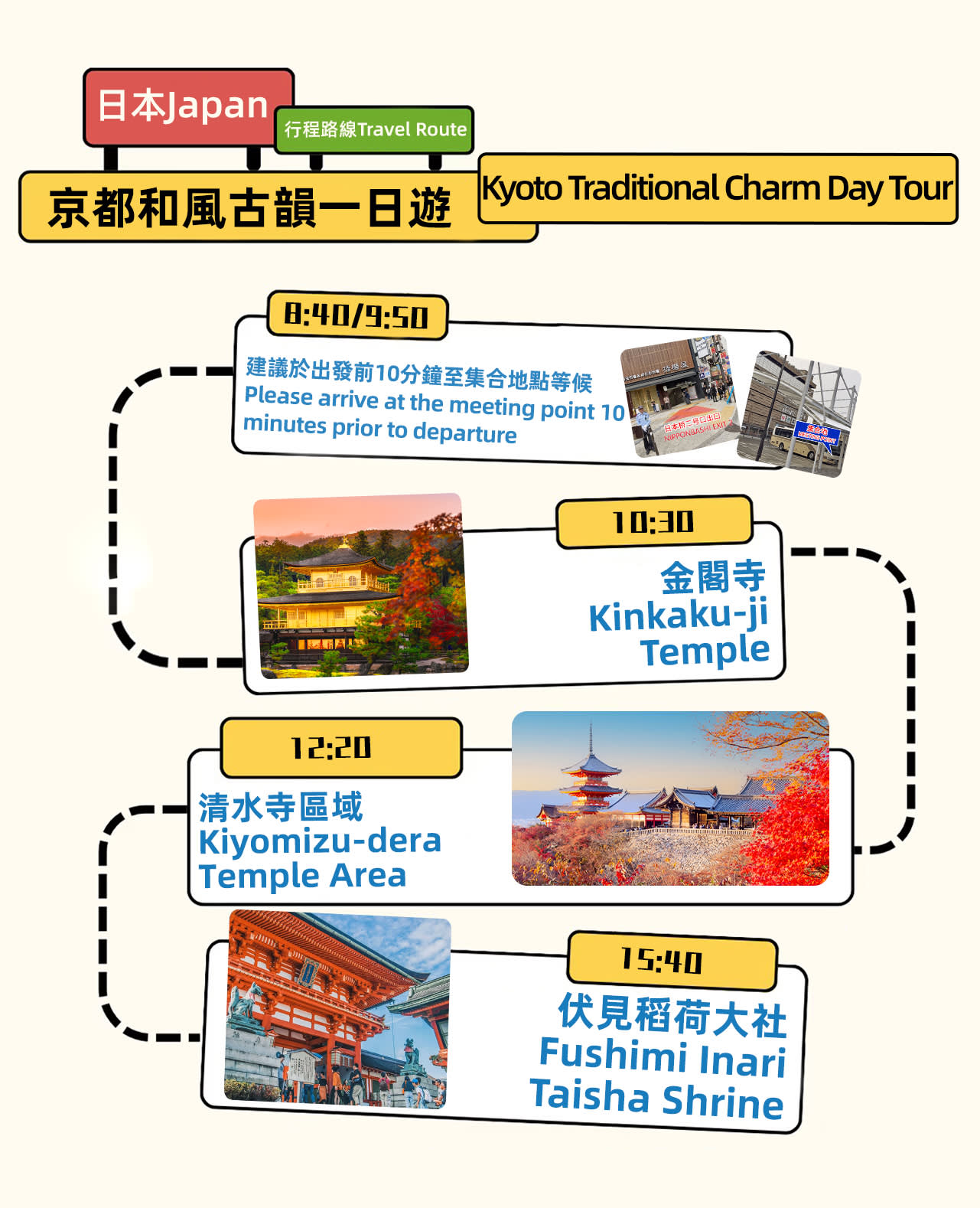 💥여행 전 안내: 출발 전날 밤, 대략 20:00~21:00 사이에 이메일을 통해 자세한 가이드 및 차량 정보를 보내드릴 예정이니 반드시 확인해 주시기 바랍니다💥. 🌸오늘 저희는 총 세 곳의 관광지, 금각사-청수사 구역-후시미 이나리 신사를 방문합니다. 알찬 여정, 지금부터 시작합니다🌸