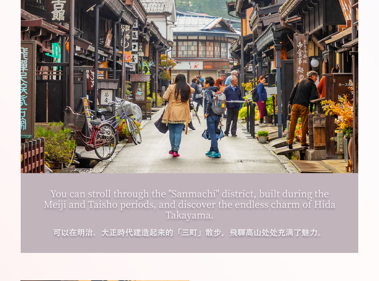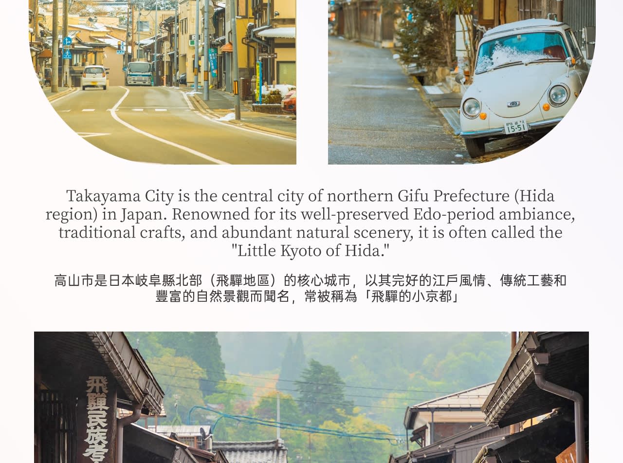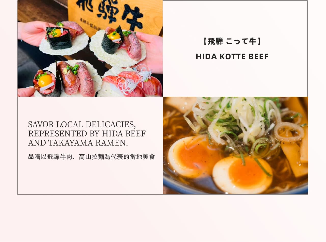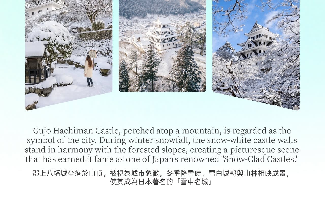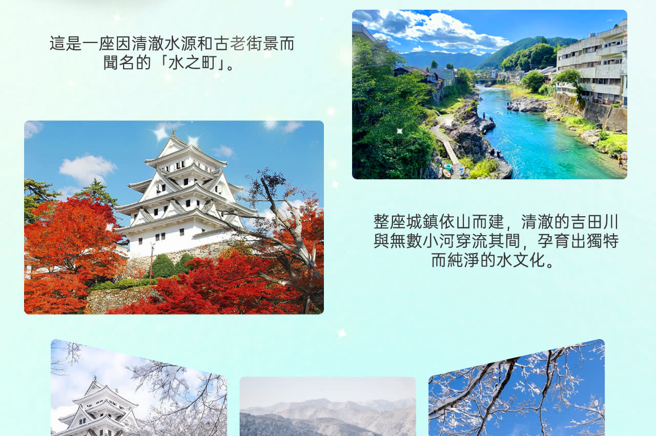 • # # 나고야 출발, 군상 하치만, 히다 다카야마, 시라카와고 갓쇼무라를 방문하여 옛 거리, 설국, 맛집을 만나보세요~\n\n* 첫 번째 목적지는 ‘물의 도시’로 불리는 군상 하치만입니다. 이 고성은 맑고 투명한 강과 종횡으로 뻗어있는 수로로 유명합니다. 마을은 산을 따라 지어졌으며 목조 상가, 돌판 길, 생활 용수가 공존하는 모습은 에도 시대의 생활 풍경을 완벽하게 보존하고 있습니다. 거리를 따라 산책하면서 느리고 순수한 지역 리듬을 느낄 수 있습니다. 산 정상에 위치한 군상 하치만성에 오르면 탁 트인 전망을 감상할 수 있으며, 성 아래 마을과 산을 한눈에 볼 수 있습니다. 겨울에는 흰 눈으로 덮여 더욱 고요한 분위기를 자아내 설경 명소로 불립니다.\n\n* 그 후 히다 다카야마로 이동하여 ‘히다의 작은 교토’라고 불리는 역사 지구로 들어갑니다. 산마치 거리에는 에도 시대부터 메이지 시대에 걸쳐 지어진 상가 건축물이 즐비하며, 술 창고, 수공예품 가게, 전통 과자 가게가 잇따라 펼쳐집니다. 이곳에서는 히다규 요리, 다카야마 라면 등 현지 음식을 맛볼 수 있을 뿐만 아니라 히다 장인의 섬세하고 정교한 장인 정신을 가까이에서 감상할 수 있어 지역 문화와 음식의 매력을 느낄 수 있는 최고의 장소입니다.\n\n* 마지막으로 세계 문화 유산인 시라카와고 갓쇼무라를 방문합니다. 사방이 산으로 둘러싸인 마을에는 갓쇼 양식 초가 지붕집이 논을 따라 지어져 자연과 공존하는 생활의 지혜를 보여줍니다. 가파른 지붕은 폭설을 막기 위해 만들어졌으며 독특한 농촌 풍경을 구성합니다. 그 안을 거닐면 마치 시간이 천천히 흐르는 산속 비경으로 들어온 듯한 느낌을 주며, 이 여행에 가장 기억에 남는 마침표를 찍습니다.