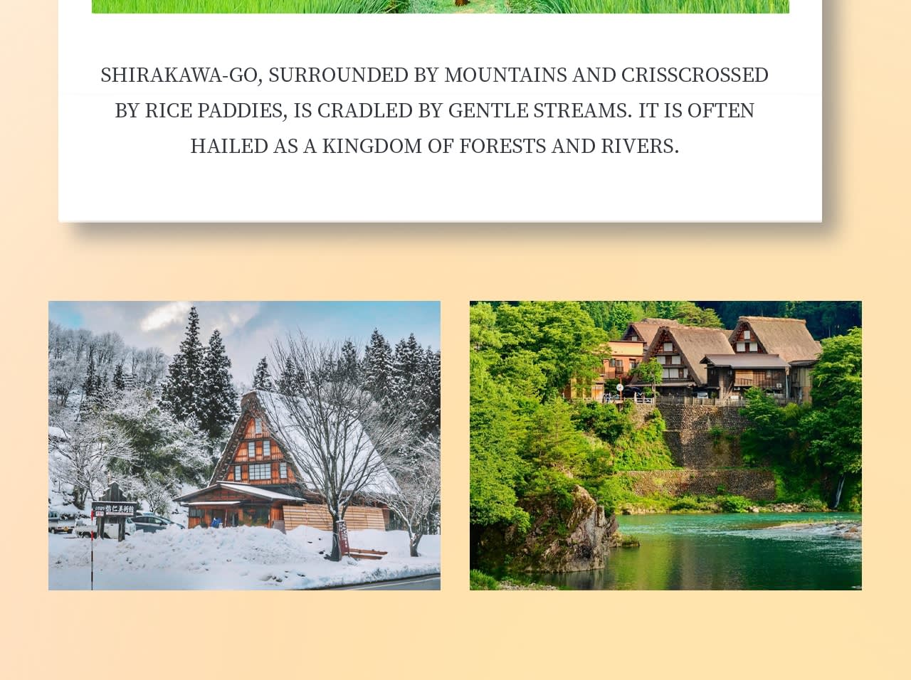 * 시라카와고 갓쇼무라를 방문하여 세계 유산 등급의 억새 지붕 마을과 설국 산촌의 원시 풍경을 감상해보세요.
