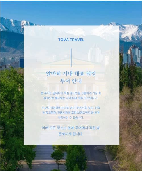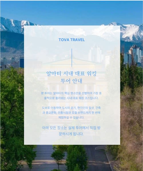- 알마티의 역사·문화·건축을 현지 가이드의 인사이트와 함께 깊이 있게 체험할 수 있습니다.