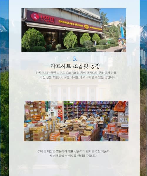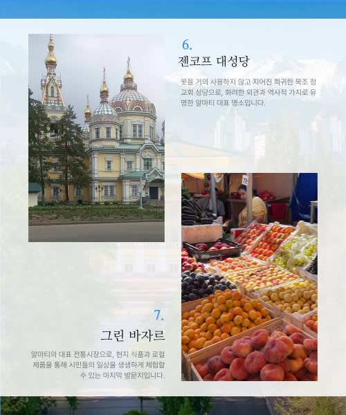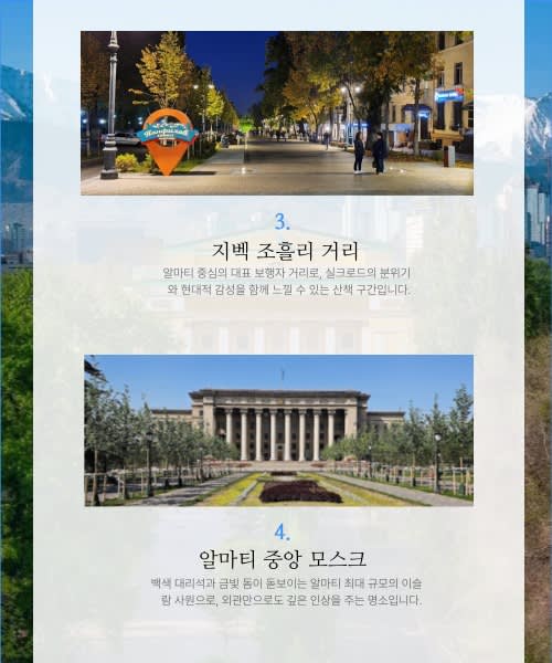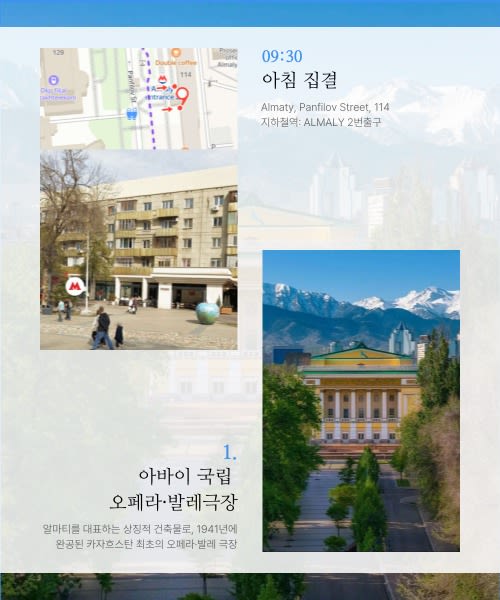 - 재래시장, 현지 카페, 거리 풍경 등 알마티 주민들의 일상을 생생하게 느끼는 워킹 루트로 구성되어 있습니다.