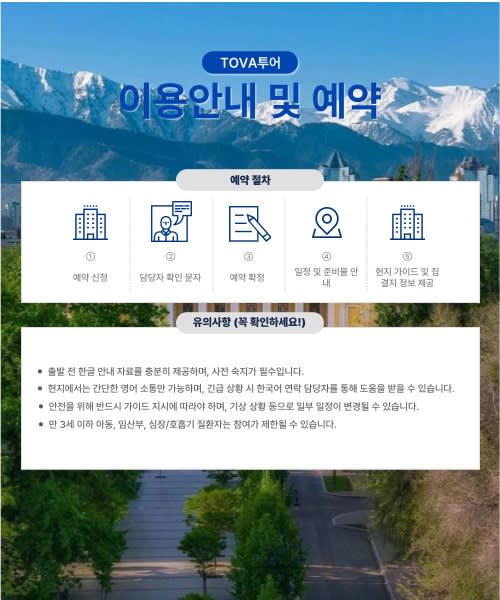📢 투어 정보 ・ 만나는 시간 : 09시 30분 ・ 만나는 장소 : 지하철역 ALMALY 2번 출구 (Almaty, Panofilov Street, 114) ・ 투어 소요시간 : 2시간 30분 (09:30 ~ 12:00) ・ 예약 확인 방법 : 예약 확인 방법 : 예약 ‘확정’ 상태가 되면, 예약이 정상적으로 완료된 것으로 보시면 됩니다. 현장에서는 결제 예약 페이지 또는 예약 정보를 통해 확인해 주세요. ※ 별도 안내가 있을 경우, 해당 지침을 따라주시기 바랍니다.