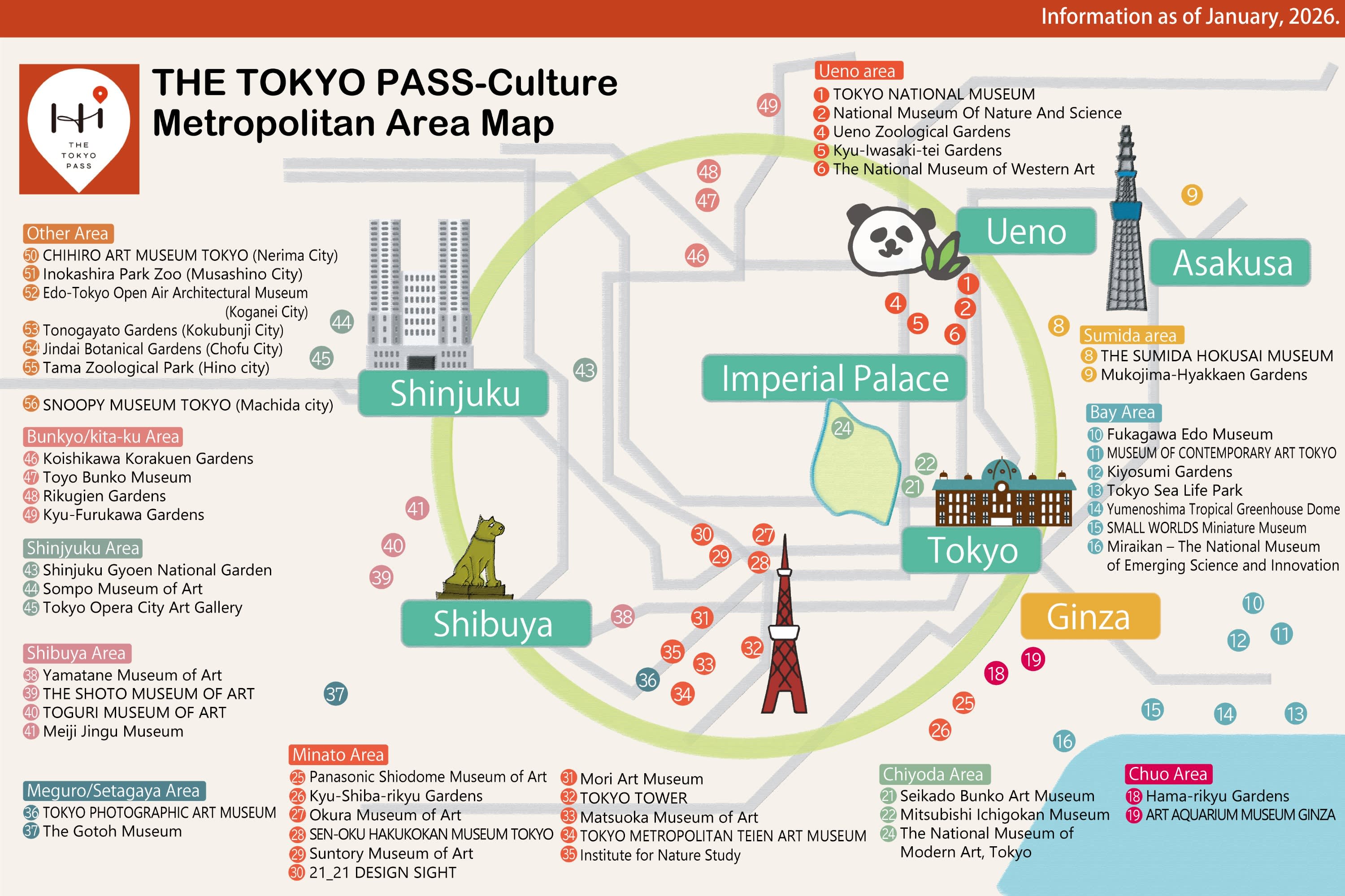 * 도쿄의 문화 명소를 마음껏 즐겨보세요! THE TOKYO PASS는 약 50개의 인기 박물관, 공원, 정원, 동물원, 수족관에 무제한 입장할 수 있는 저렴한 스마트폰 패스입니다.