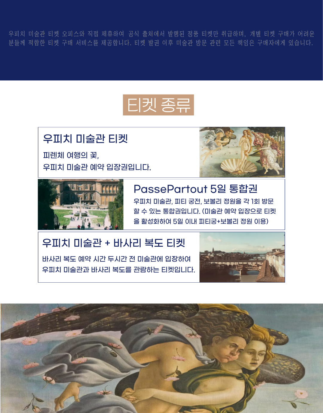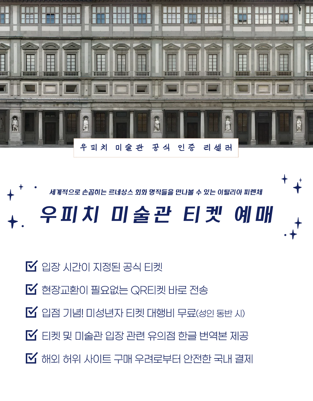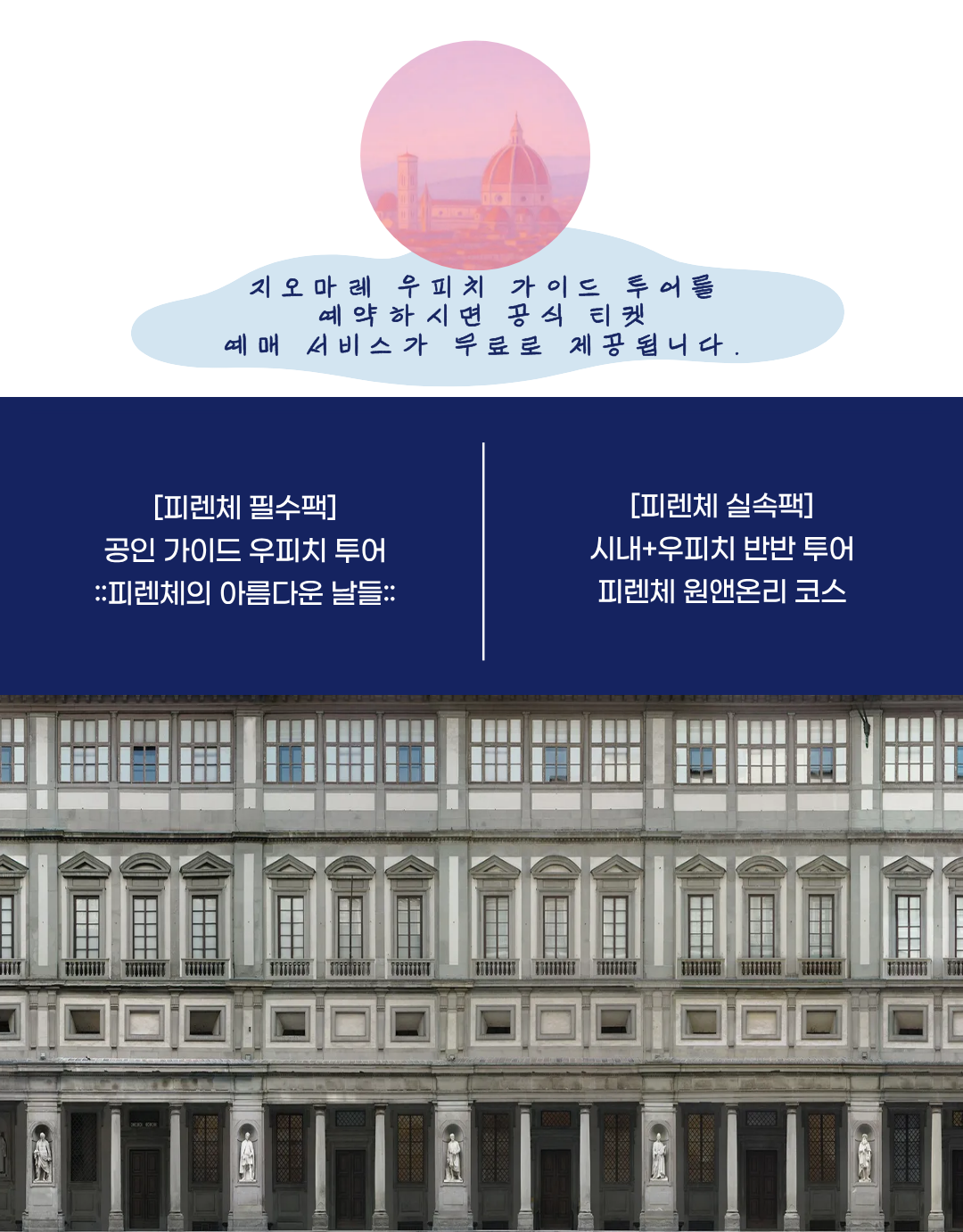 아래 우피치 가이드 투어를 예약하시면 해당 공식 티켓 예매 서비스가 무료로 제공됩니다.