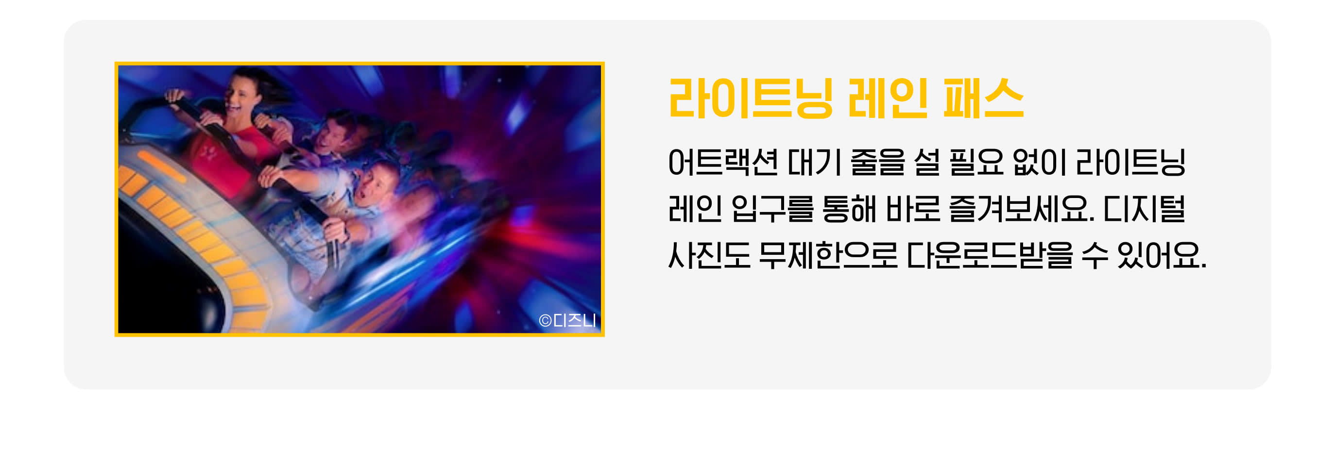 * 라이트닝 레인 멀티 패스로 업그레이드하시면 지정 어트랙션을 더 빠르게 즐길 수 있답니다. 라이트닝 레인은 하루에 어트랙션당 한 번만 이용 가능해요.
