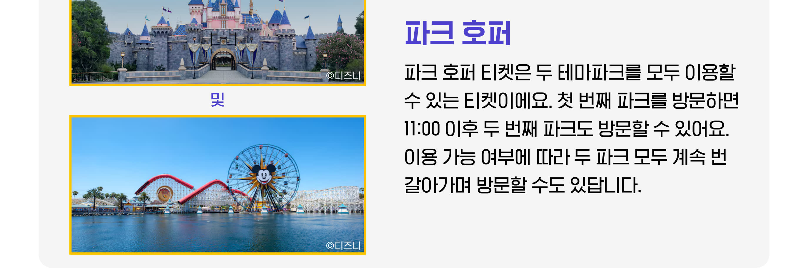 * 별도의 티켓 필요: 디즈니랜드파크와 디즈니 캘리포니아 어드벤처파크는 별도의 입장권이 필요합니다. 파크 호퍼또는 1일 1파크 멀티데이 티켓을 구매하셔서 두 파크 모두 방문하시는 것을 추천드려요.