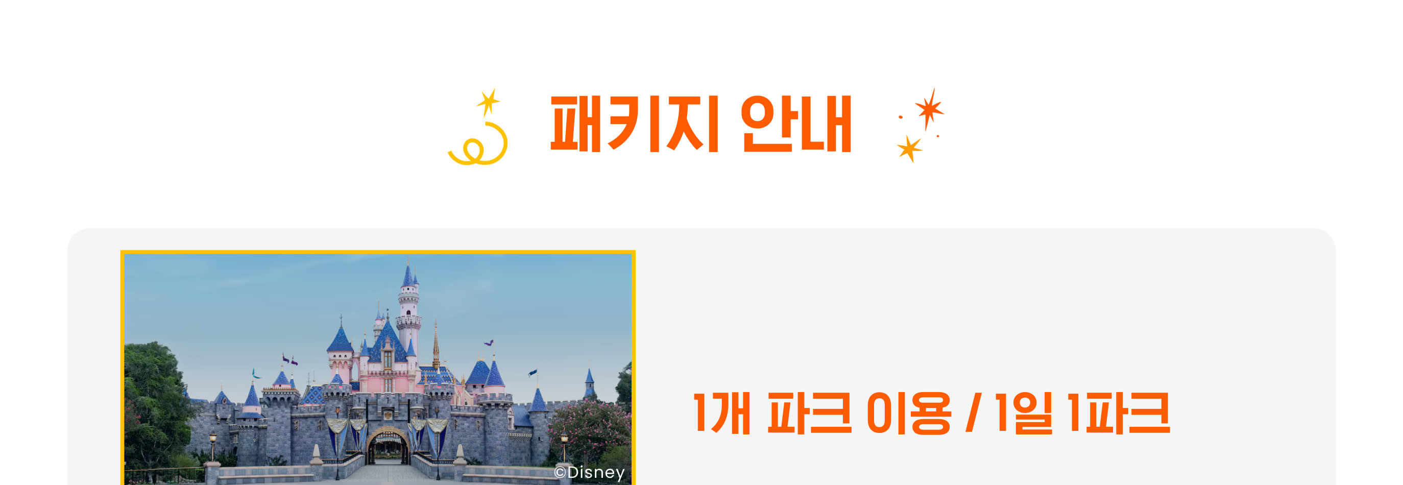 - Tips: * 다양한 어트랙션과 액티비티가 가득한 두 파크 모두 방문해보세요. 파크 호퍼 티켓을 예약하시면 더더욱 알차게 즐길 수 있습니다. 멀티 데이 패스는 첫 입장 이후 13일 동안 유효합니다. * 대기 시간을 줄이고 싶다면 라이트닝 레인으로 업그레이드해보세요. 일부 어트랙션을 빠르게 즐길 수도 있고 이외 다양한 혜택도 누릴 수 있어요. (라이트닝 레인옵션을 선택 후 패키지 상세정보 참고) * 예기치 못한 상황으로 인해 특정 어트랙션, 체험, 혜택이 변경 또는 이용 불가가 될 수 있습니다. 또한 수용 인원이 제한되거나 폐쇄될 수 있습니다.