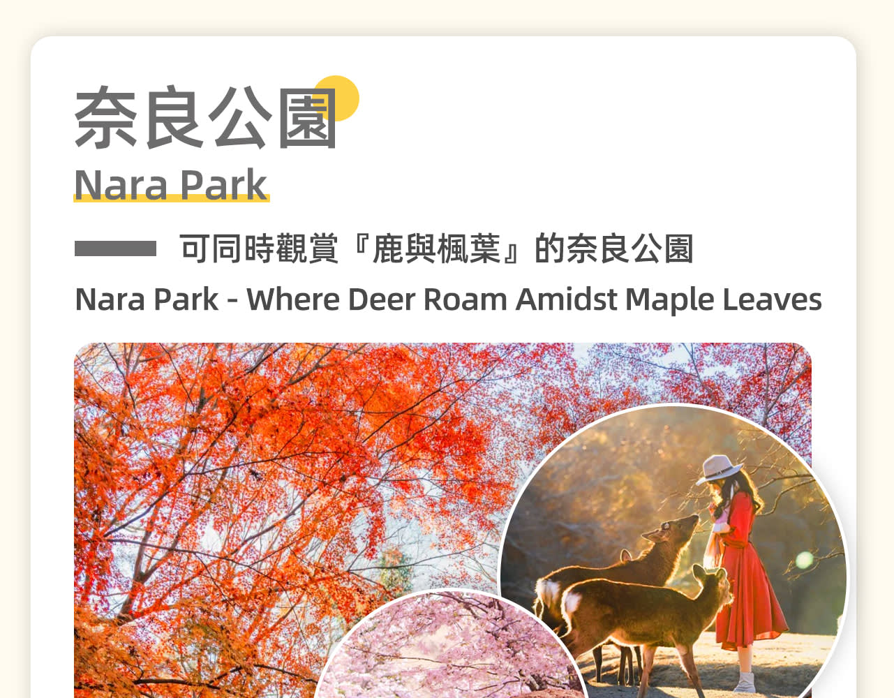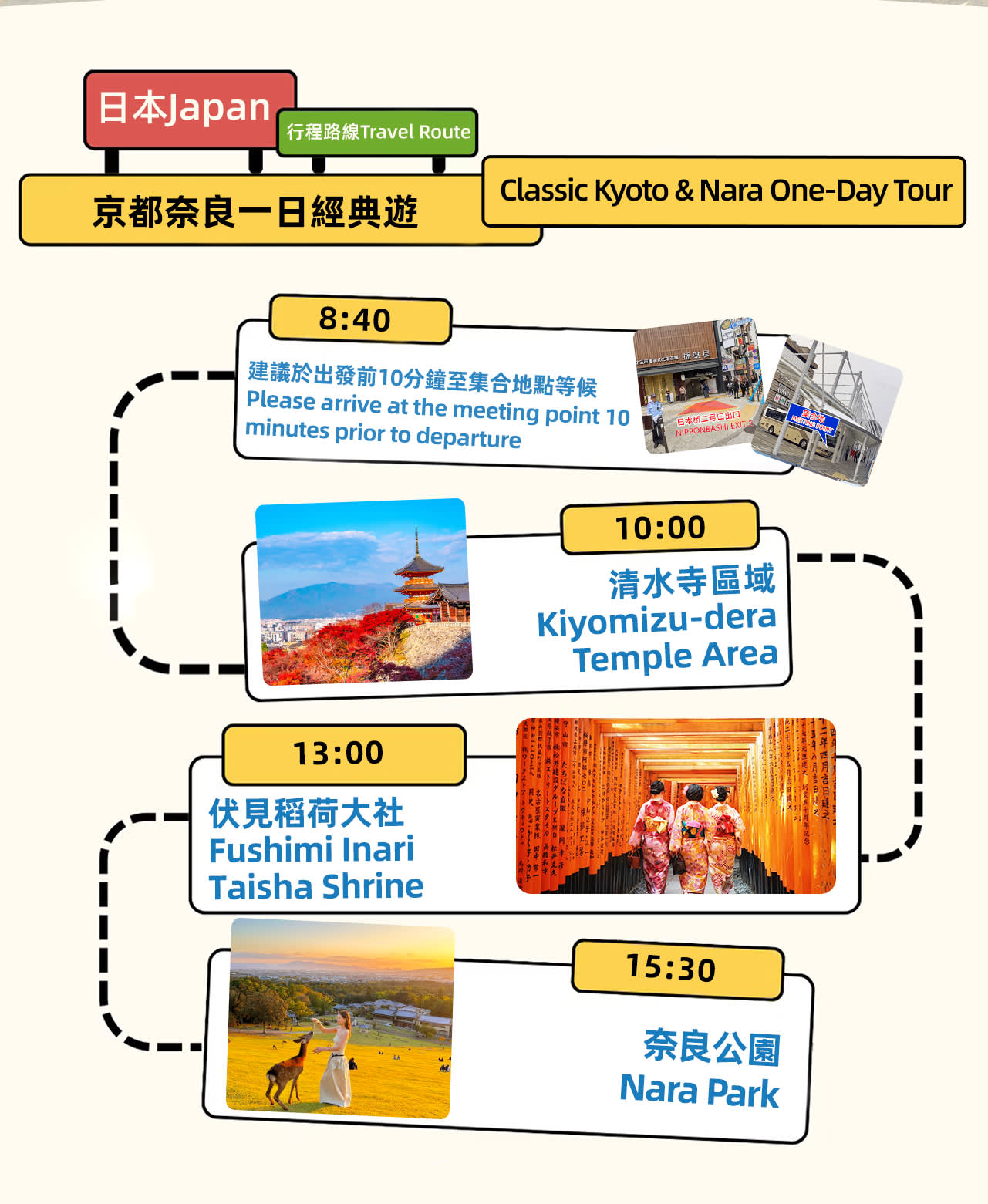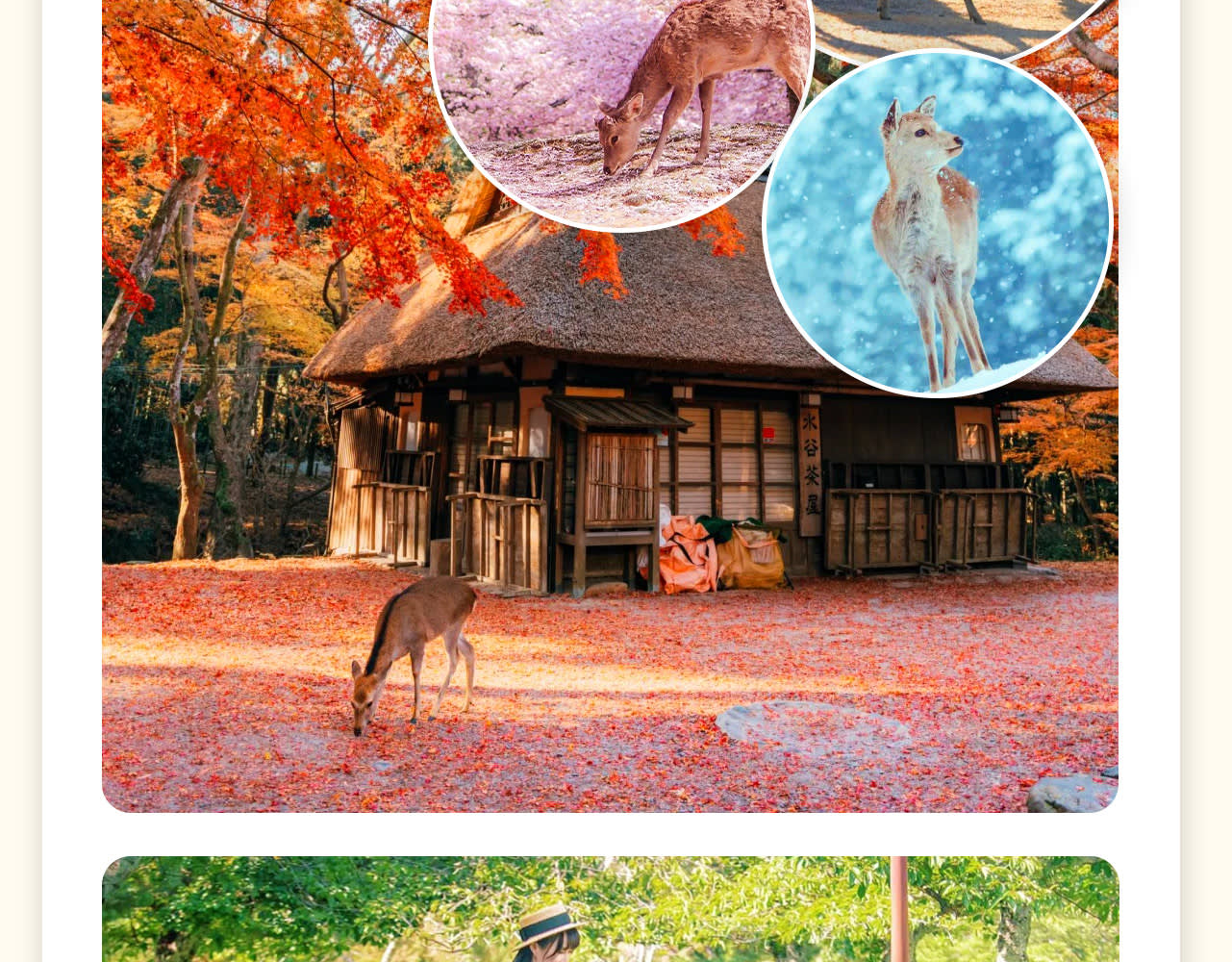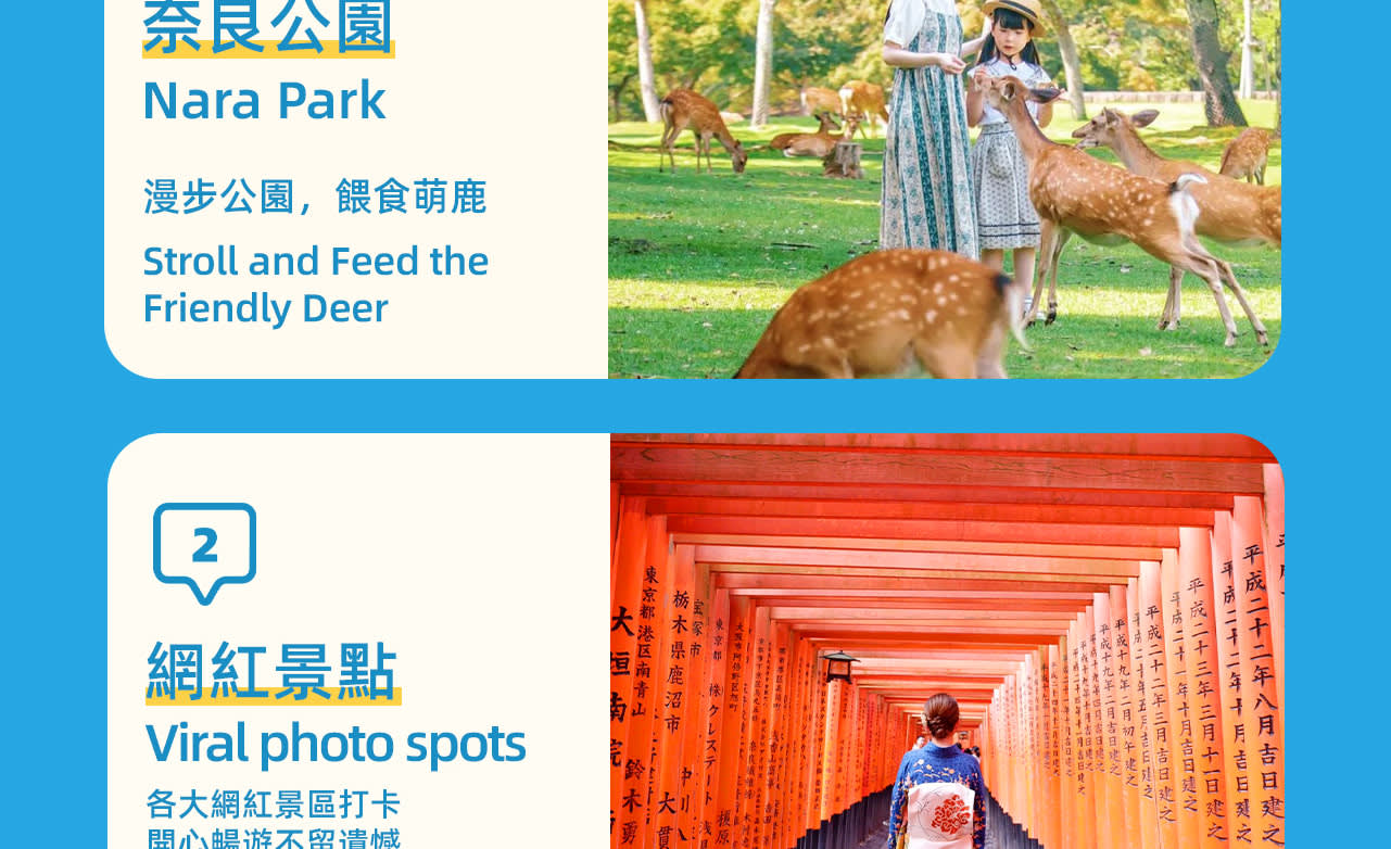 * 세 번째 장소: 나라 공원, 사슴과 단풍의 아름다운 경치를 동시에 볼 수 있는 공원으로, 공원 안의 단풍은 상록수의 선명한 초록색과 대비되어 더욱 화려하게 보입니다. 이 관광 명소들은 각기 독특한 특징을 가지고 있어 교토 & 나라 세계 문화유산 당일 여행을 구성합니다. 자연경관이든 문화 체험이든, 풍성하고 행복한 추억을 얻을 수 있을 것입니다. 저희와 함께 교토와 나라의 매력을 탐험하고 이 기쁨을 나누세요!