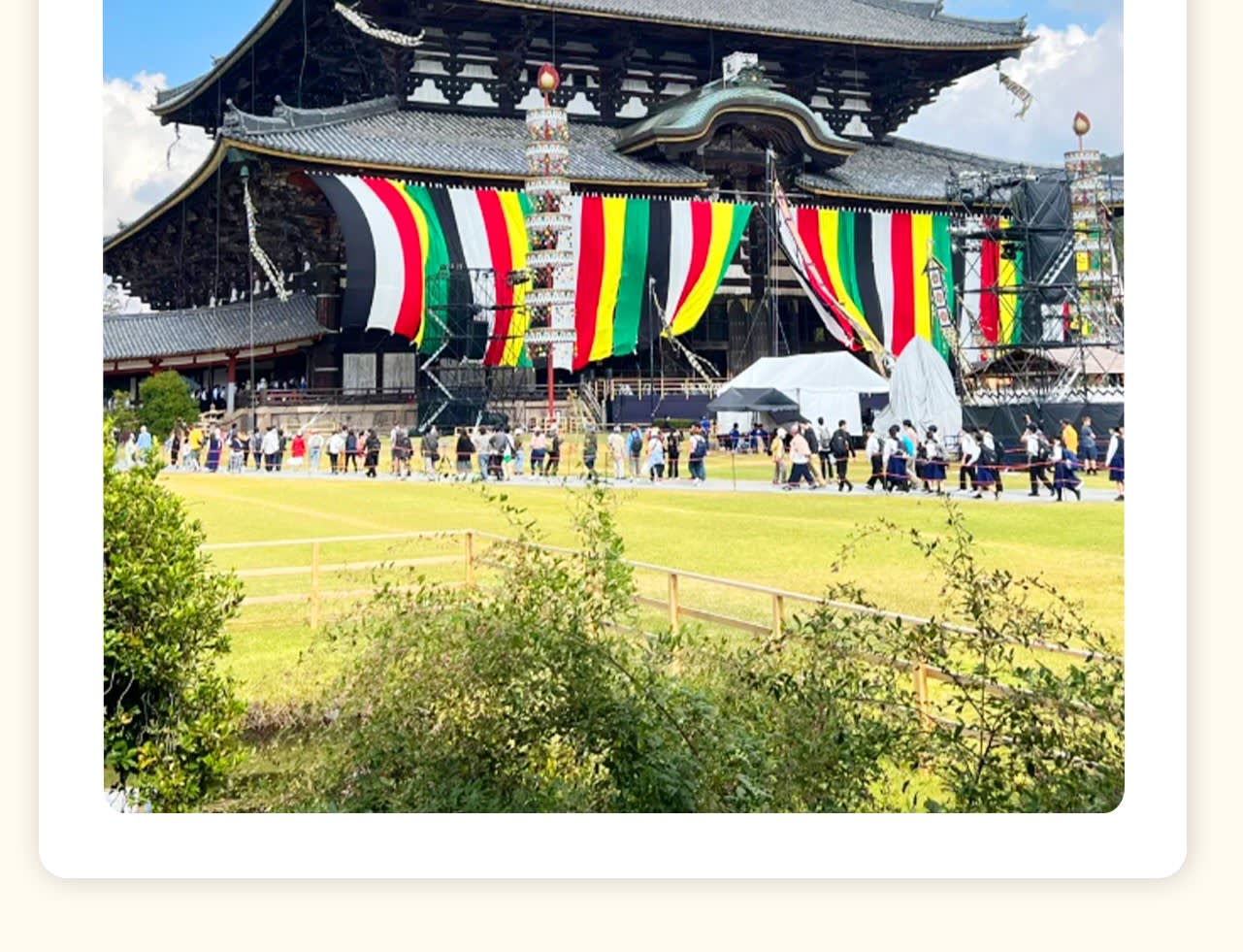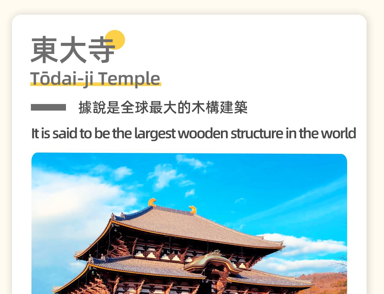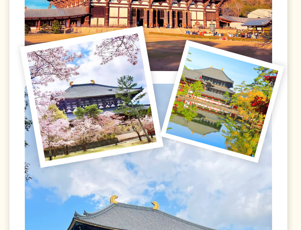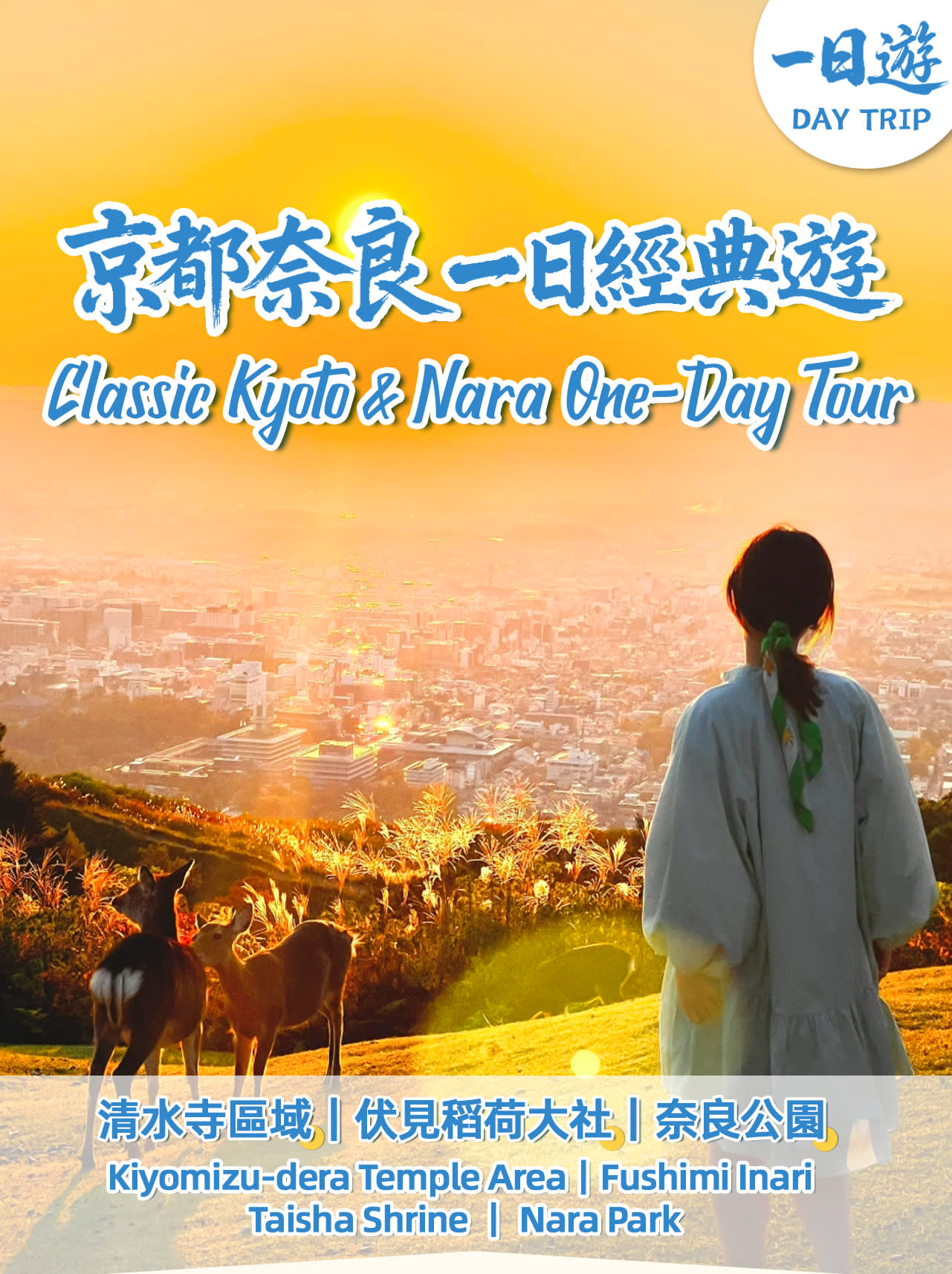 * 세 번째 장소: 나라 공원, 사슴과 단풍의 아름다운 경치를 동시에 볼 수 있는 공원으로, 공원 안의 단풍은 상록수의 선명한 초록색과 대비되어 더욱 화려하게 보입니다. 이 관광 명소들은 각기 독특한 특징을 가지고 있어 교토 & 나라 세계 문화유산 당일 여행을 구성합니다. 자연경관이든 문화 체험이든, 풍성하고 행복한 추억을 얻을 수 있을 것입니다. 저희와 함께 교토와 나라의 매력을 탐험하고 이 기쁨을 나누세요!