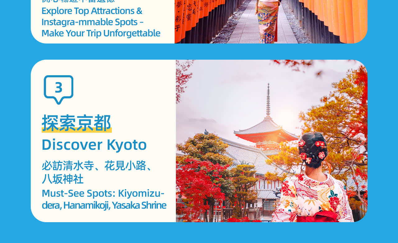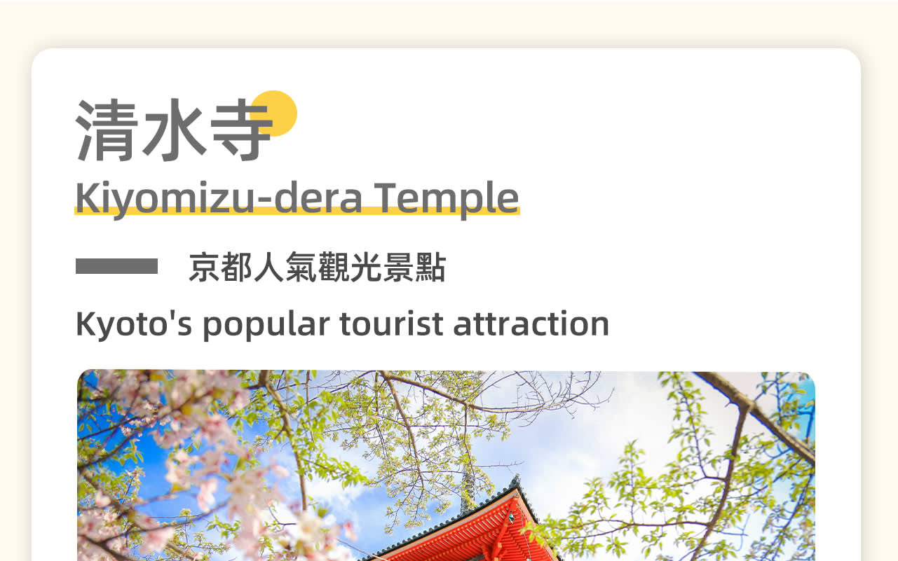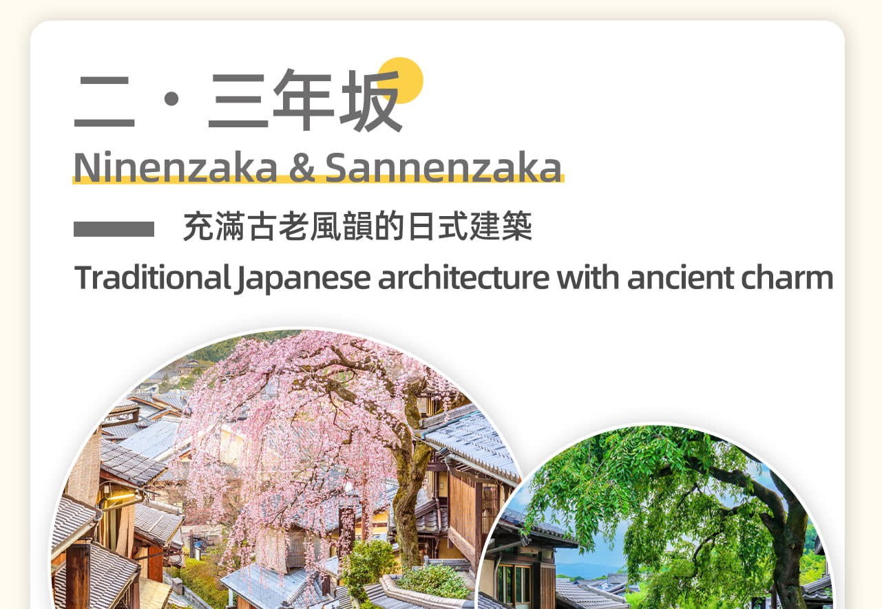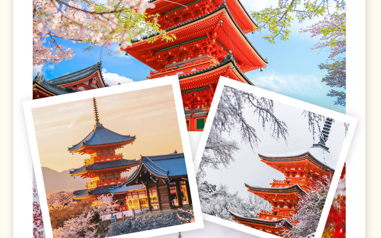 * 첫 번째 장소: 기요미즈데라 지역, 가을의 기요미즈데라는 온 산이 온통 단풍으로 뒤덮여 절경을 이룹니다. 추천 여행 코스: 기요미즈데라 - 니넨자카, 산넨자카 - 이시베이코지 - 기온, 하나미코지 - 야사카 신사