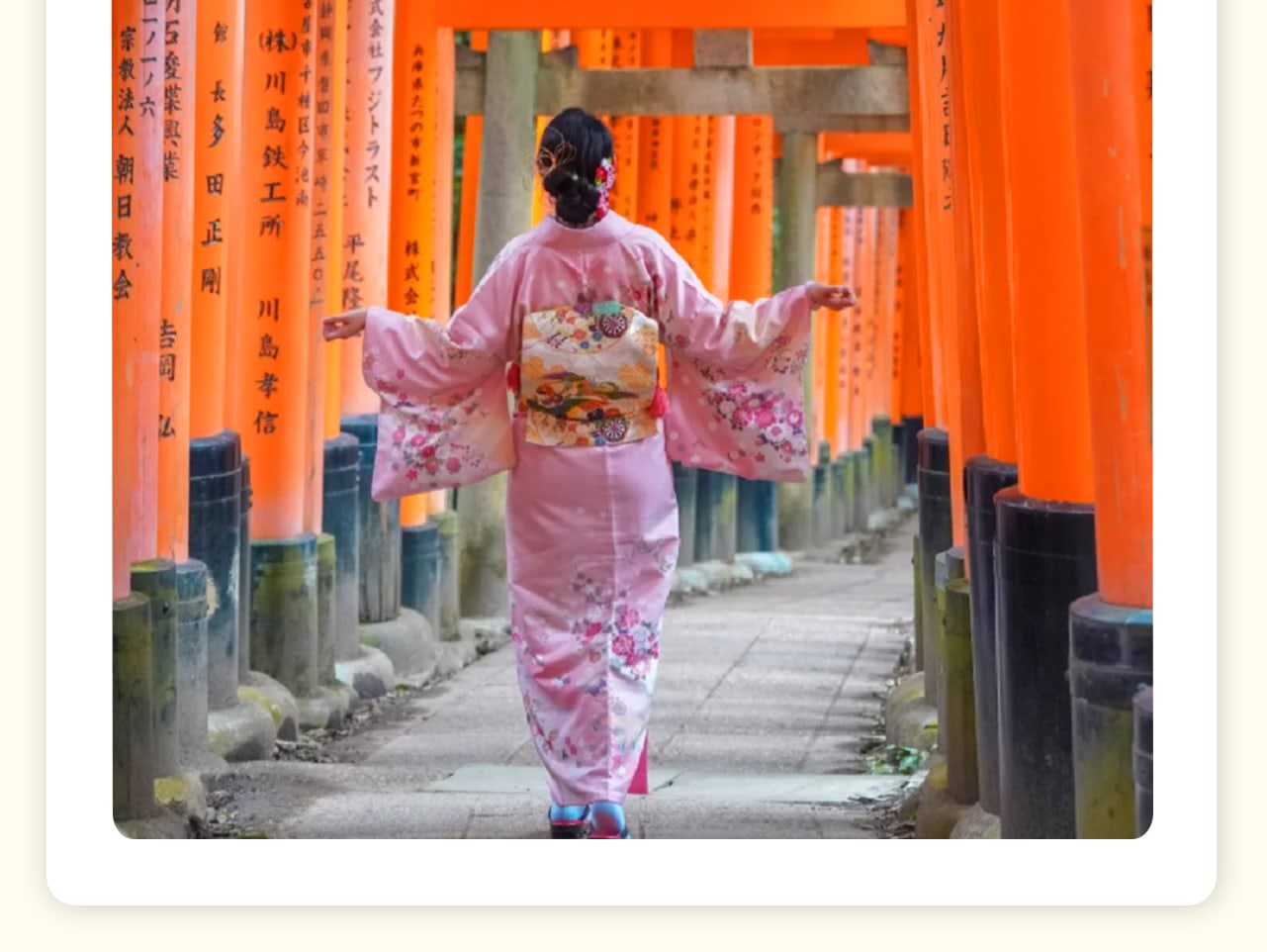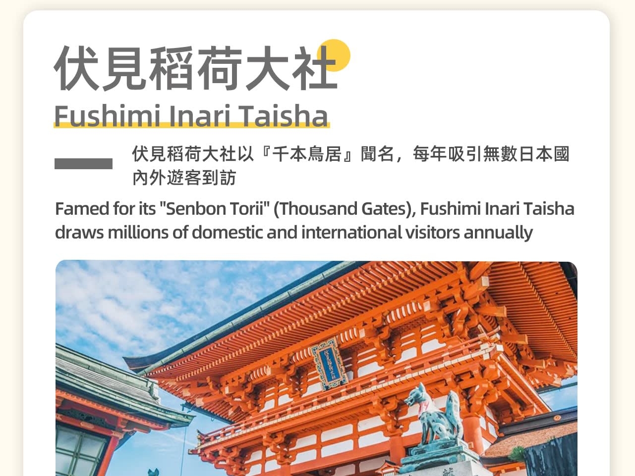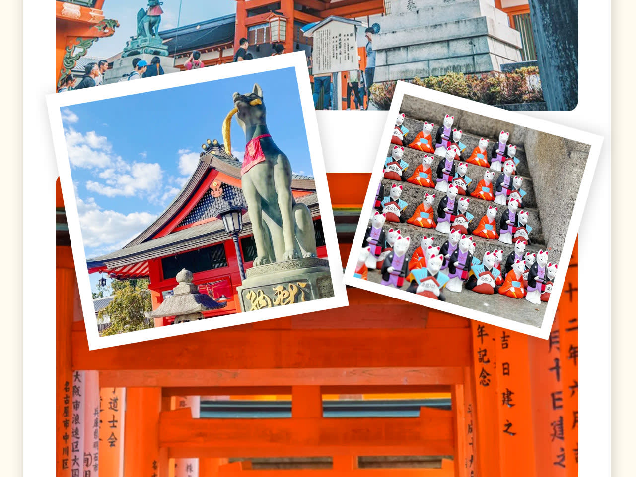 * 두 번째 장소: 후시미 이나리 신사는 「센본도리이」로 유명하며, 매년 수많은 일본 국내외 관광객이 방문하며, 3년 연속 세계 최대 여행 웹사이트 조사에서 「외국인이 가장 좋아하는 일본 관광지」 1위를 차지했습니다.
