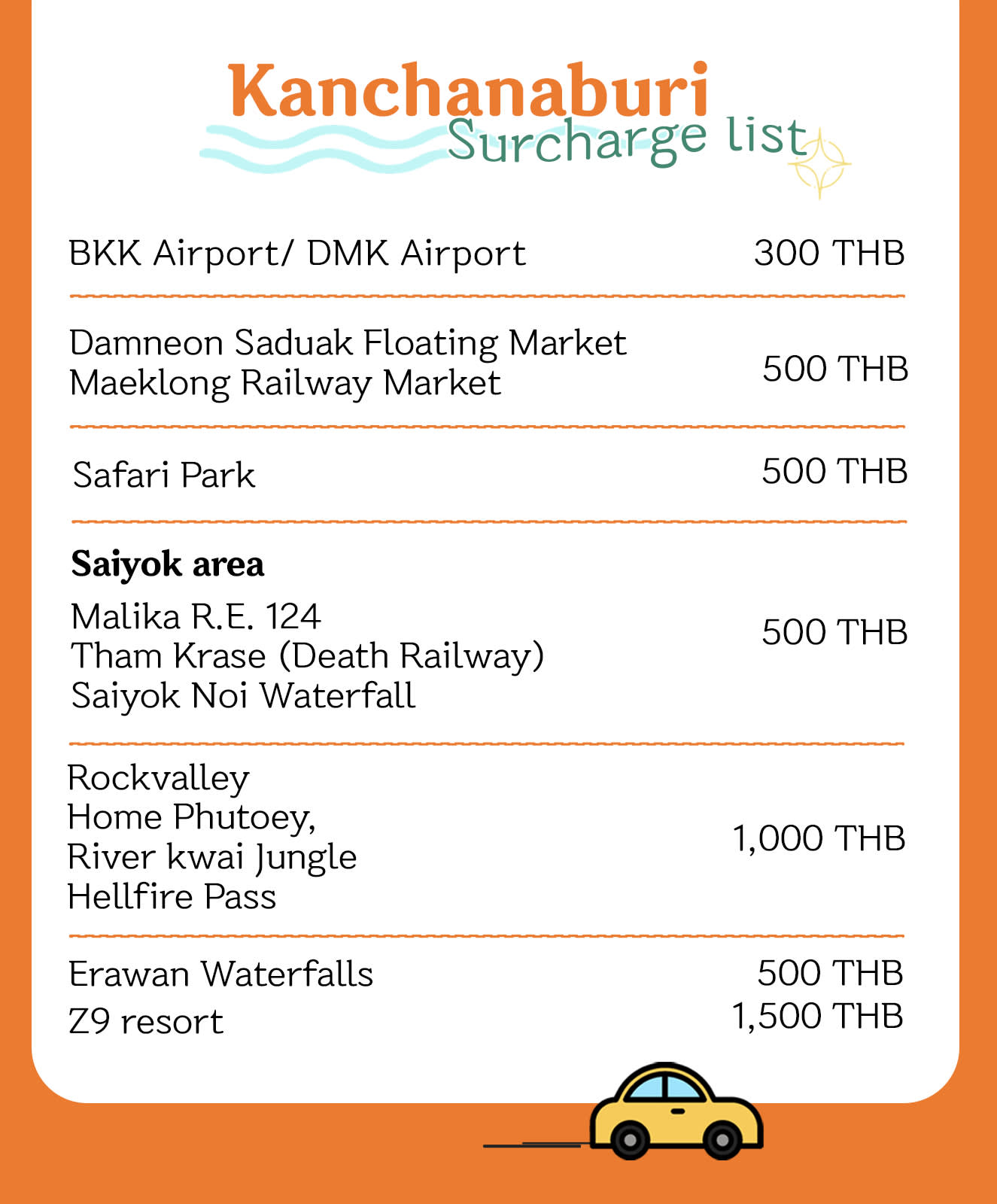 ▶칸차나부리 출발 (일일 투어) - 이용요건 * 신장 109cm 이하 또는 만 0-4세 아동은 요청 시 아동용 카시트를 이용할 수 있습니다. 모든 요청은 이용 가능 여부에 따라 제공됩니다. 아동용 카시트 요청이 승인되면 현지 업체에서 사전에 안내해 드립니다. - 추가정보 * 본 패키지는 10시간 동안 전세 차량 서비스를 제공합니다. 추가 시간은 시간당 300 THB의 추가 요금이 부과됩니다(최대 2시간). * 본 상품에 제시된 일정은 샘플입니다. 원하는 일정에 맞춰 일부 활동을 생략하거나 맞춤형 일정으로 변경할 수 있습니다. * 유아용 시트는 사전 요청 시 이용 가능하며, 1개당 200 THB의 추가 요금이 부과됩니다. * 차량 정보를 꼼꼼히 확인하시고 예약해 주세요. * 기사님은 간단한 영어만 구사할 수 있습니다. * 추가 요금 부과 지역: Saiyok THB500 / Erawan THB500 / Home Phutoey THB1,000 / Z9 resort THB1,500 * 추가 요금이 발생할 경우, 현지 업체에서 사전에 안내해 드립니다. * 성수기 할증 요금: 300 THB/일/차량 (2025년 12월 30일-31일 및 2026년 1월 1일-2일)