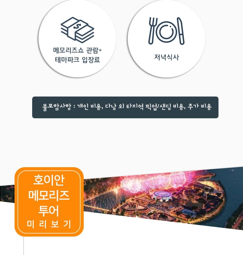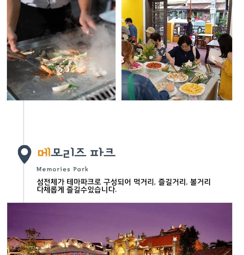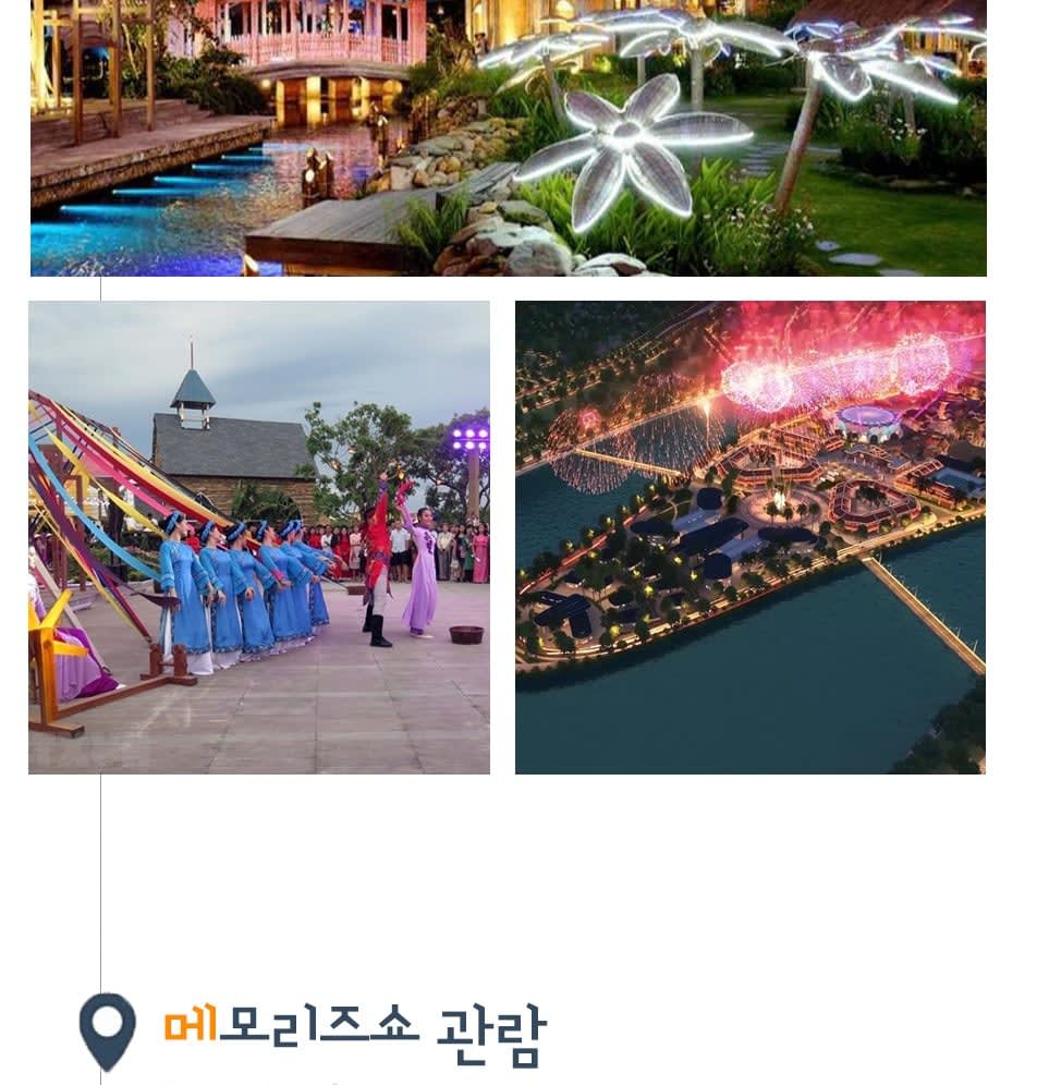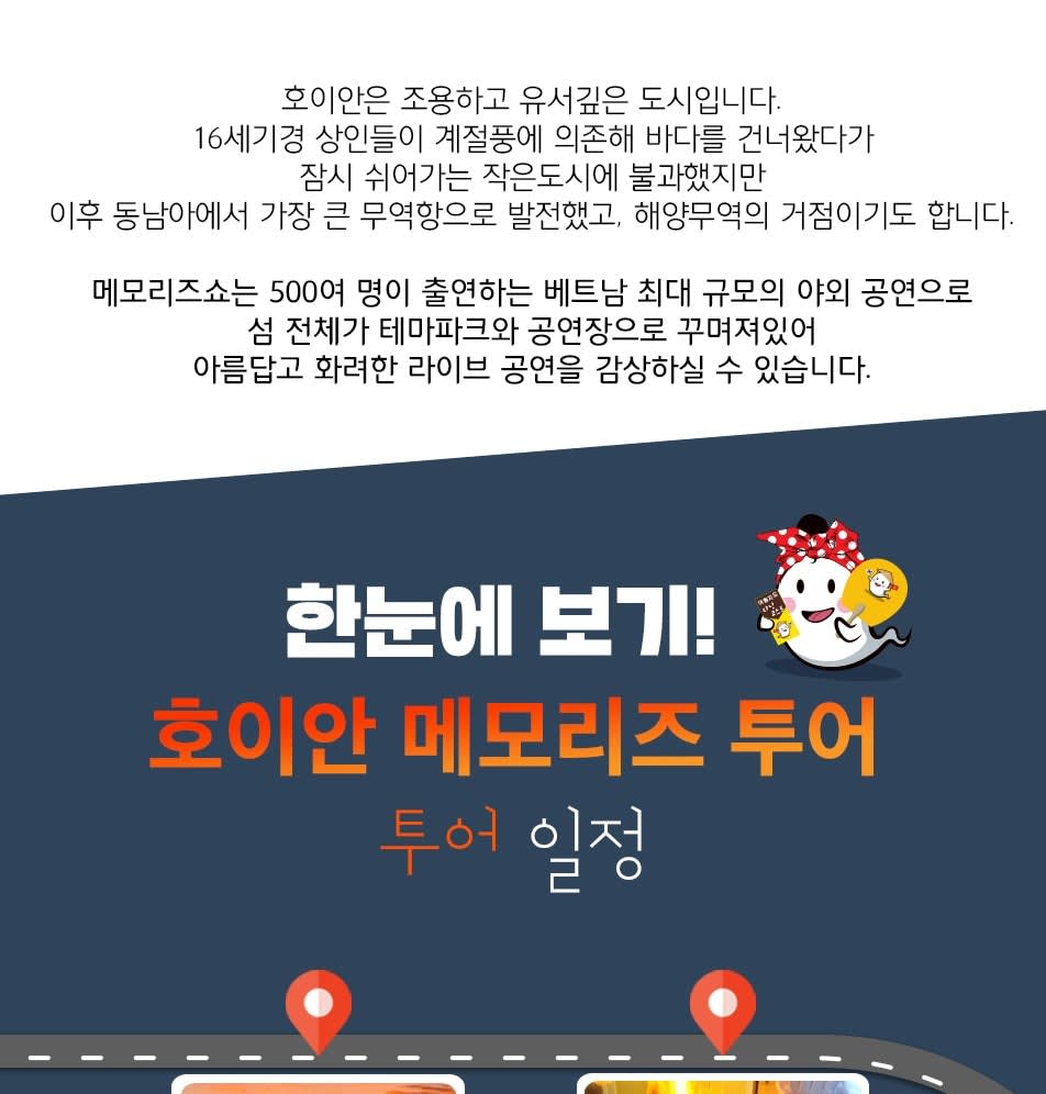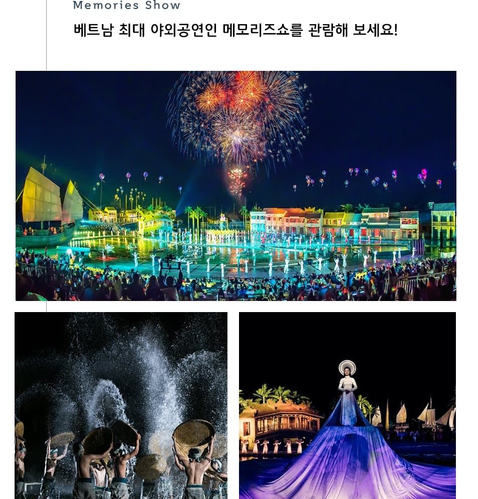 * '메모리즈 쇼'는 500여명의 배우들이 선사하는 대규모 베트남 전통 공연을 감상해 보세요. * 베트남 전통 복장을 입은 배우들이 호이안의 400년 역사 이야기를 역동적으로 풀어 나가요. * 메모리즈 파크, 호이안 올드타운까지 관람하며 유서 깊은 호이안을 한국어로 즐겨 보세요.