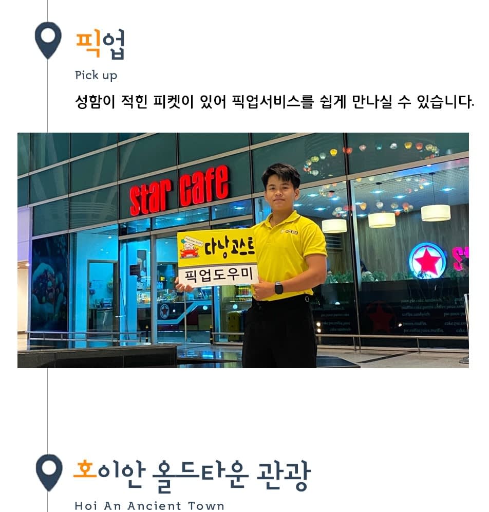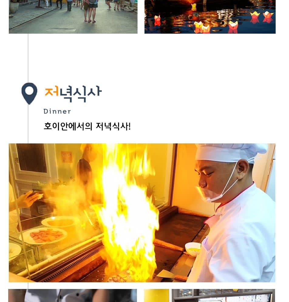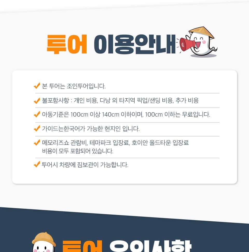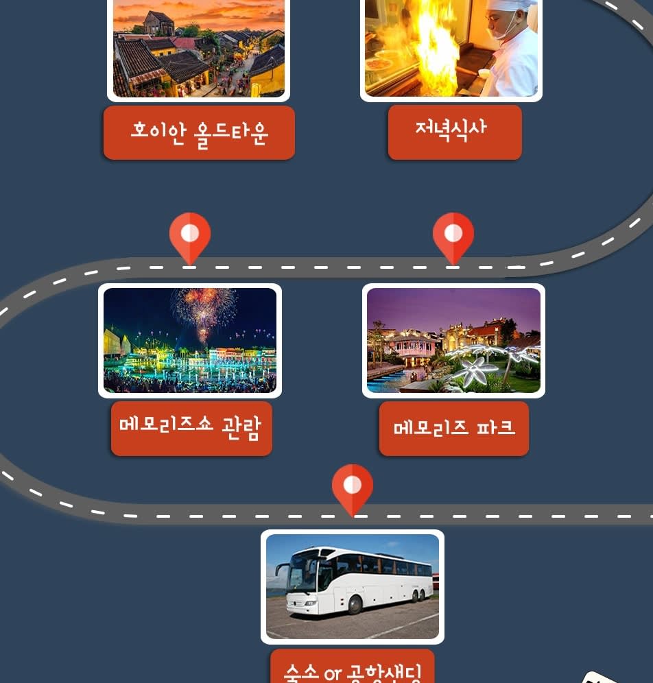 * '메모리즈 쇼'는 500여명의 배우들이 선사하는 대규모 베트남 전통 공연을 감상해 보세요. * 베트남 전통 복장을 입은 배우들이 호이안의 400년 역사 이야기를 역동적으로 풀어 나가요. * 메모리즈 파크, 호이안 올드타운까지 관람하며 유서 깊은 호이안을 한국어로 즐겨 보세요.