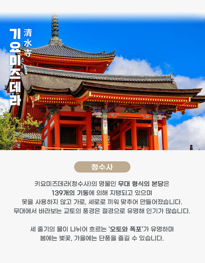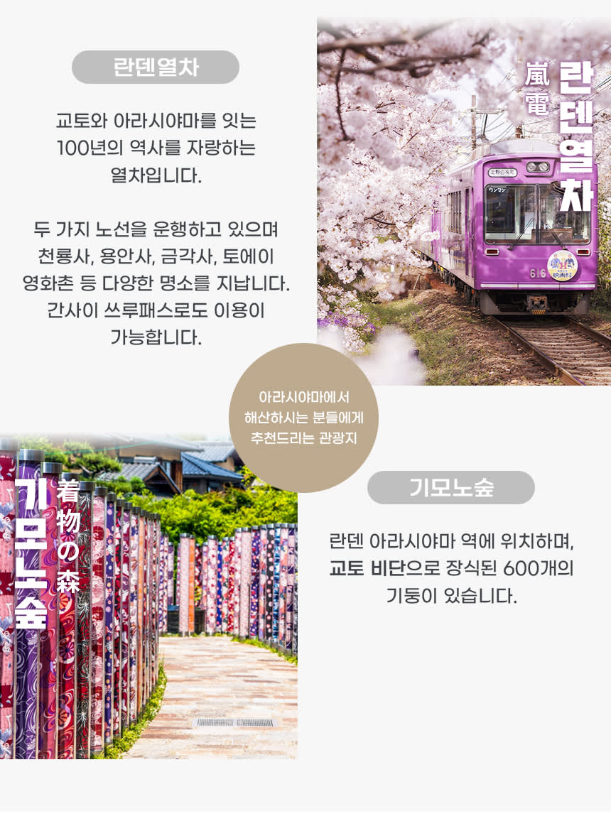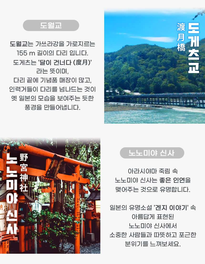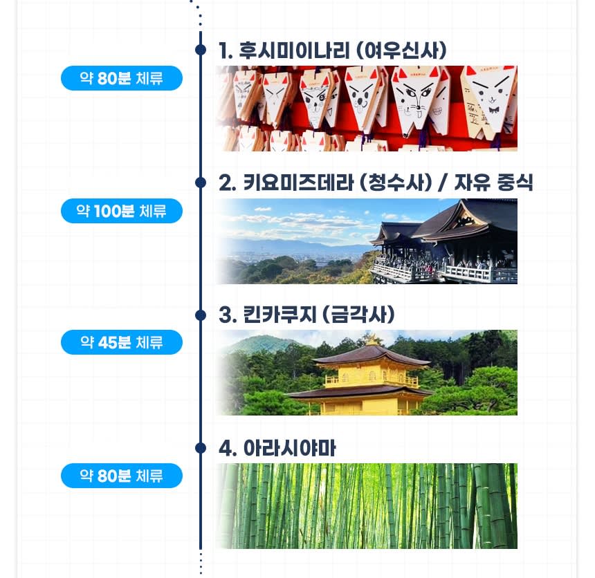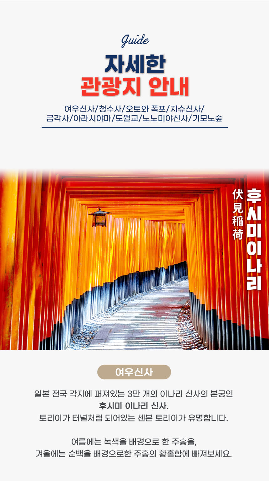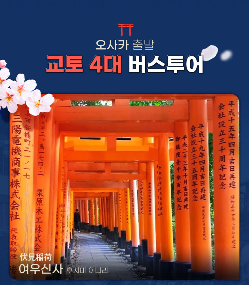 <코스> 오사카 출발 - 후시미나리 신사- 동본원사- 청수사 - 아라시야마- 오사카 도착의 순서로 진행하며 , 상기 일정은 현지 사정에 의해 변경될수 있습니다.
