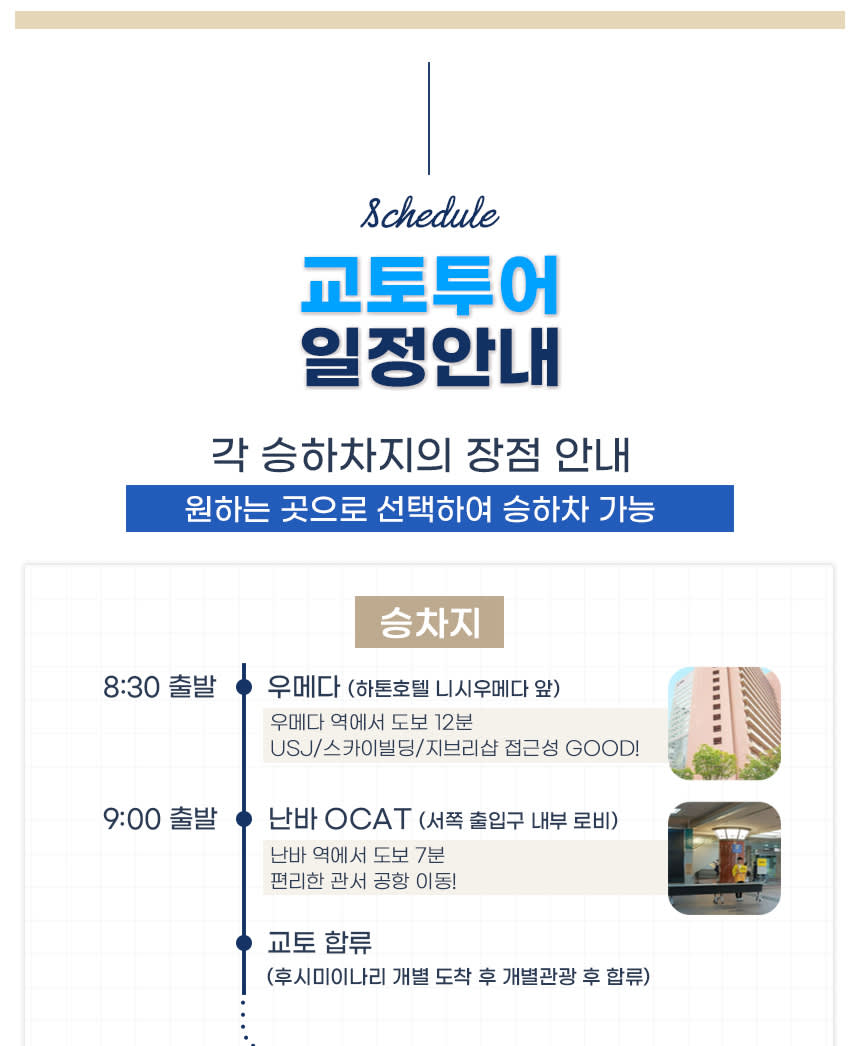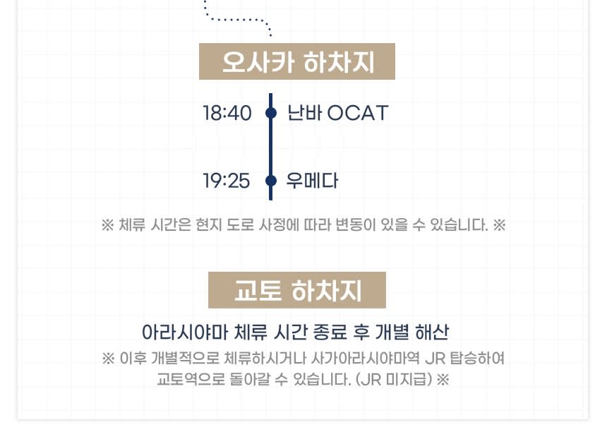 -일부 날짜는 조기에 마감될 수 있습니다. -교토역 승차의 경우 첫 관광지인 후시미이나리 개별 도착 후 청수사로 이동할때 가이드님과 미팅을 합니다.(희망 시 가이드님과 조율하여 10시 10분 경 후시미이나리 집합장소에서 만나 투어를 함께 시작할 수 있습니다.) -교토 하차의 경우 마지막 코스인 아라시야마에서 투어 종료 후 교토로 개별 이동하는 방식입니다. (교토역 기준 20분 소요) -기본적으로 단체투어는 교통상황 및 현지 상황 등을 맞추기 어려우므로 지각할 경우 중간 합류가 불가합니다.