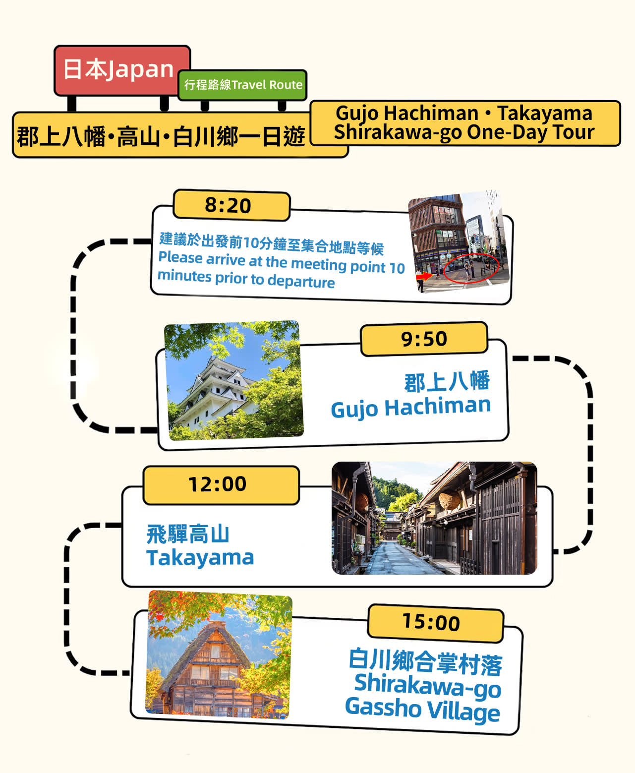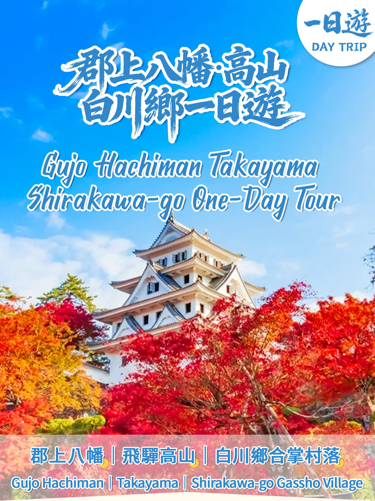 이것은 나고야에서 출발하여 기후현의 3대 핵심 관광 명소를 연결하는 대표적인 코스로, 하루 안에 일본의 자연, 고도의 풍경, 세계 유산을 감상할 수 있습니다. 첫 번째 장소: 군죠하치만: 물의 고성, 요시다 강변의 소기 물은 맑고, 에도 시대 풍의 거리와 하치만성 천수각이 어우러져 식품 모형 공예를 감상할 수 있습니다. 두 번째 장소: 히다 다카야마: 히다의 작은 교토, 산마치 옛 거리는 목조 건축물이 고풍스럽고, 히다규를 꼭 맛보아야 하며, 원숭이 인형, 목조 기념품을 구입할 수 있습니다. 세 번째 장소: 시라카와고: 세계 유산 갓쇼무라, 초가지붕이 두 손을 합장한 듯한 모습으로, 전원 풍경을 감상하며 설국의 지혜를 탐방합니다.