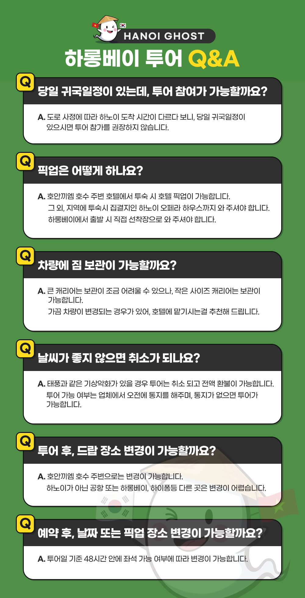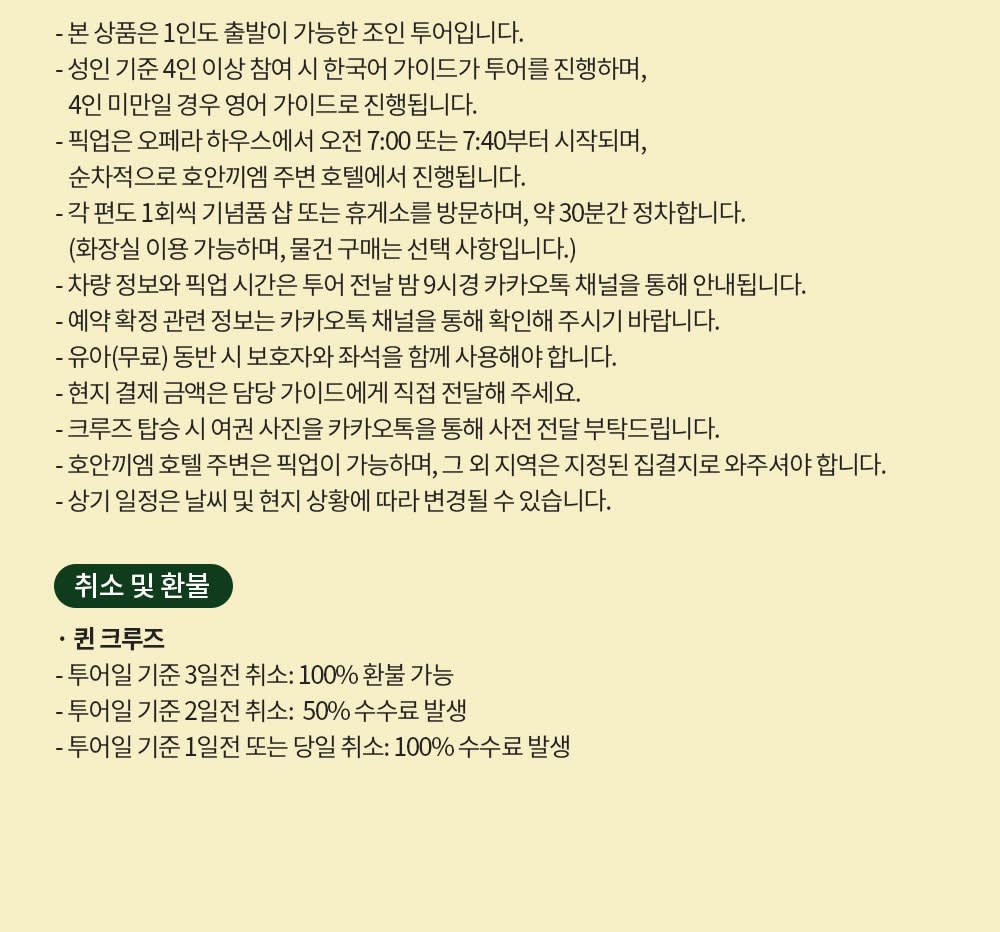 * 카카오채널로 연락주셔야 예약확정 가능하니 반드시 예약시에는 해당 카카오 채널로 연락바랍니다. (카톡검색시 @하노이고스트투어) * 4인 이상 투어 진행이 가능합니다. * 베트남 국/공휴일에는 인건비, 차량비 등이 인상되는 관계로 추가금(현지지불 등)이 발생될 수 있습니다.