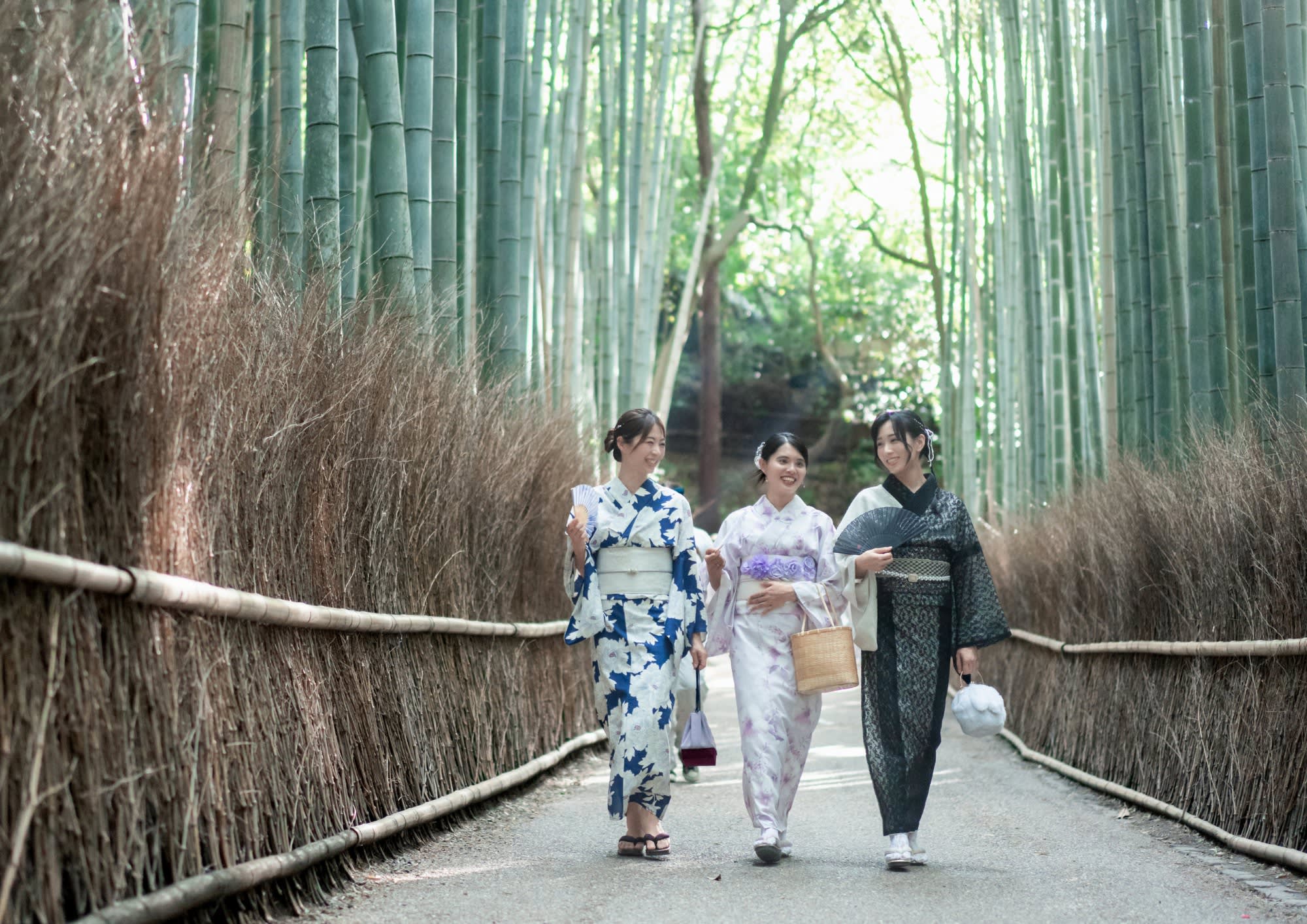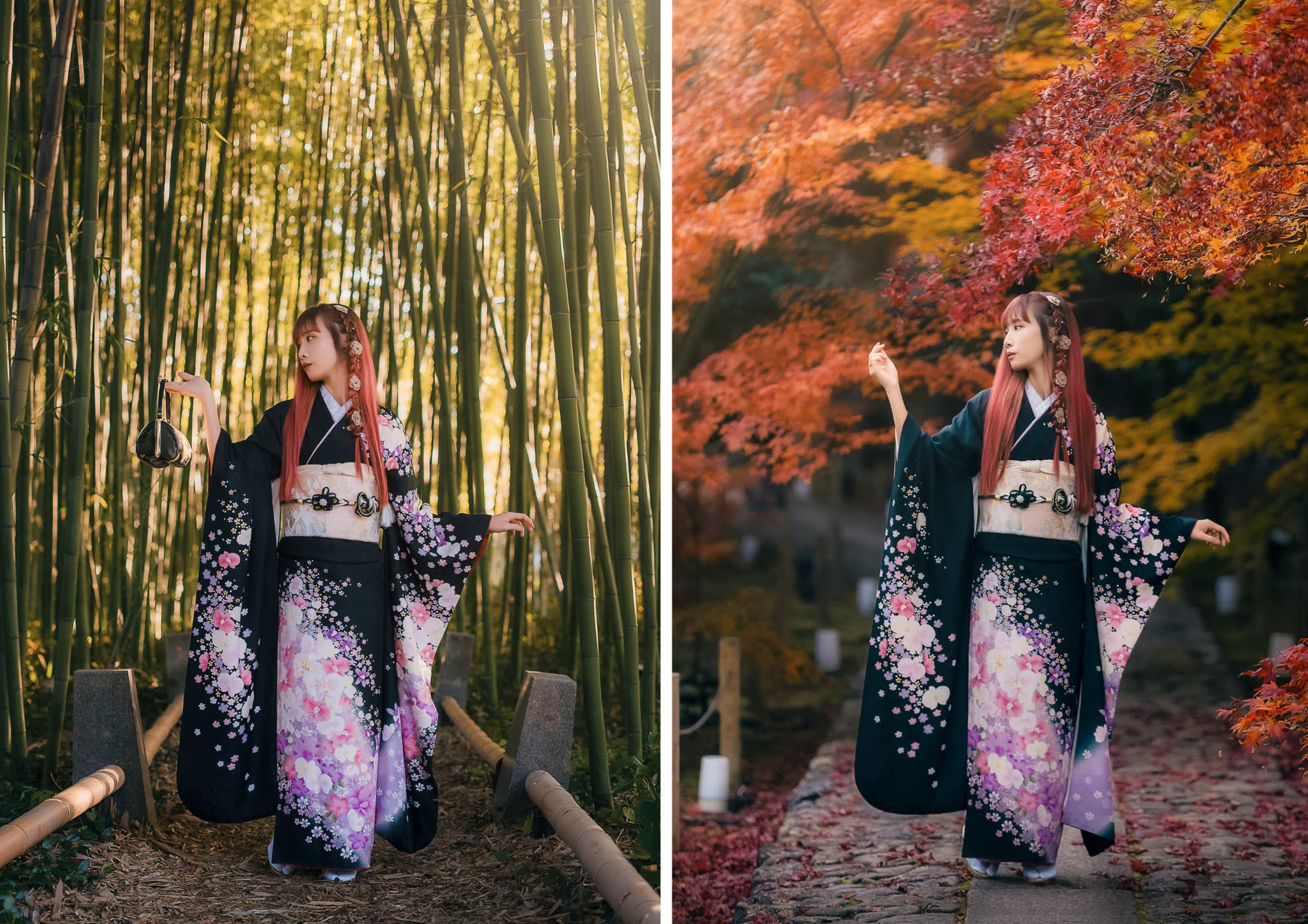 교토의 명장면을 기모노로 걷다 봄은 벚꽃, 여름은 신록, 가을은 단풍, 겨울은 설경. 기요미즈데라나 후시미이나리, 아라시야마, 기온을 기모노로 걸으면 그 경치가 마치 영화나 그림 두루마리 속 한 장면처럼 바뀌어 사진은 평생 잊혀지지 않는 추억이 됩니다.