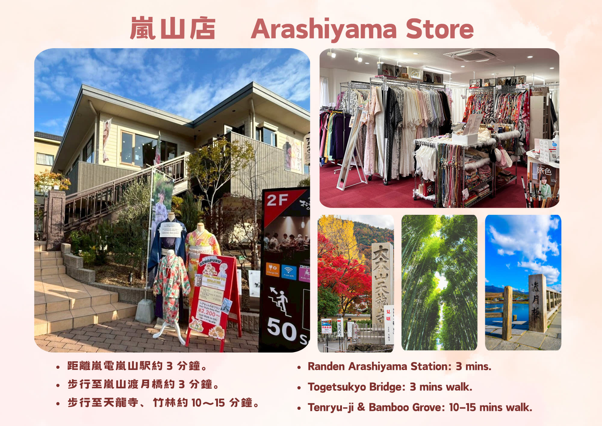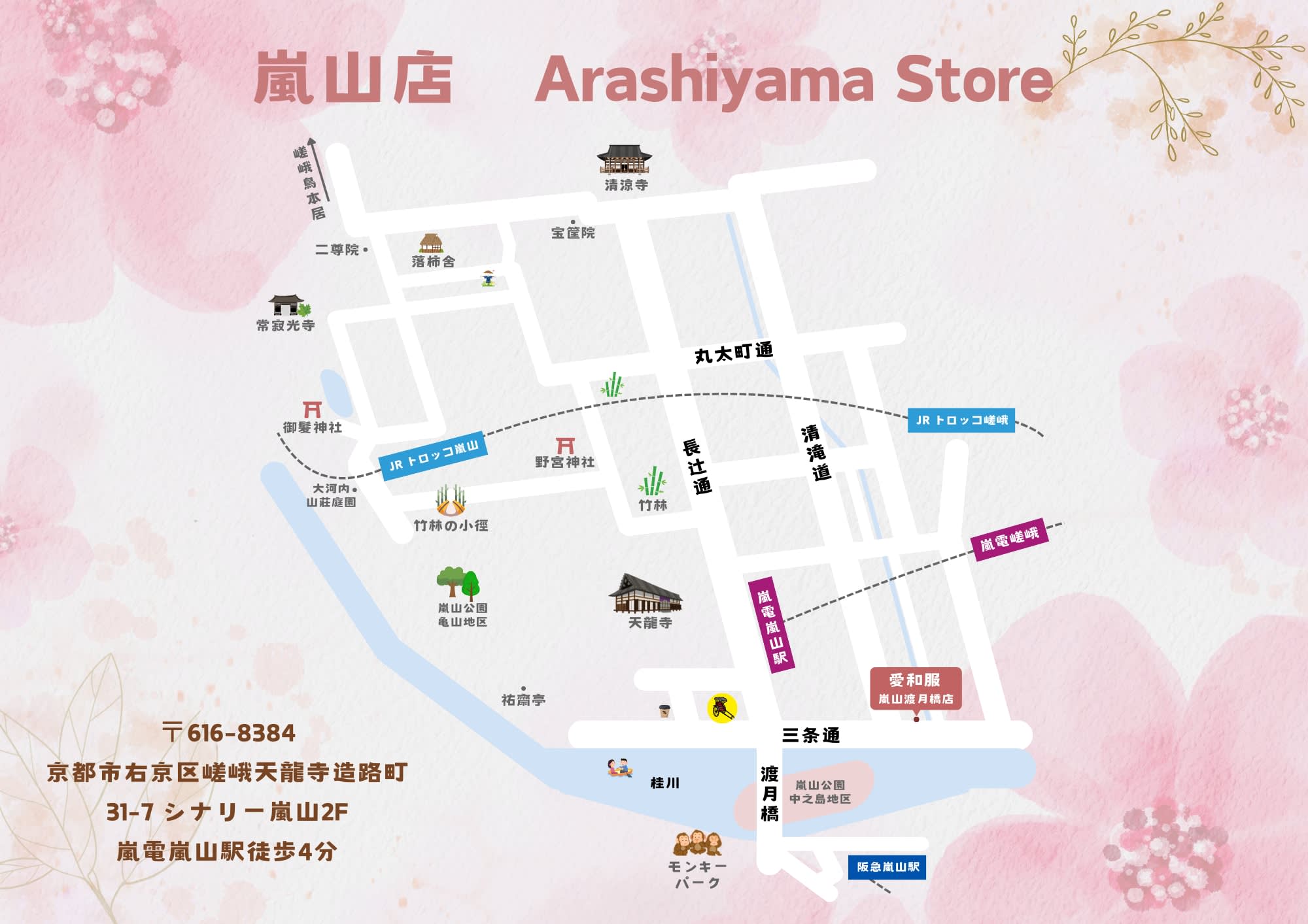 아라시야마점 안내 도게쓰쿄나 대나무 숲길까지 도보 거리. 기모노로 갈아입으면 그대로 아라시야마의 대표적인 관광 명소로 직행할 수 있습니다. 사계절 아름다운 경치 속에서 사진 촬영을 즐기고 관광 후에는 점포로 돌아와 옷을 갈아입기만 하면 됩니다. 아라시야마 산책과 기모노 체험을 한 번에 만끽할 수 있는 이상적인 위치입니다.