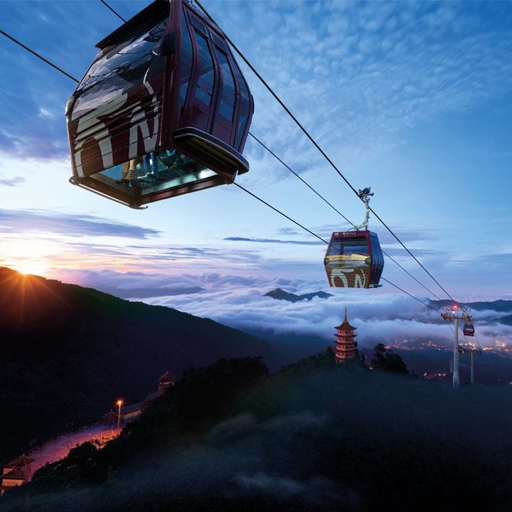 * 케이블카를 타고 고원, 깨끗한 열대 정글, 친 스위 사원, 스카이월드 테마파크의 탁 트인 전경을 감상하세요.