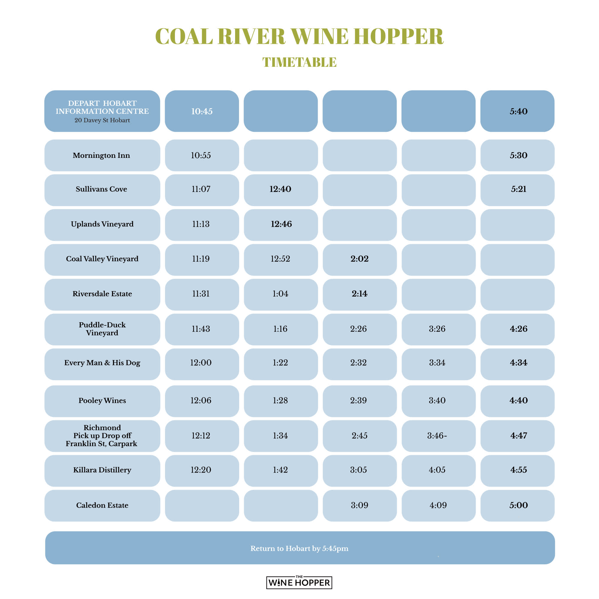 타즈매니아 콜 리버 밸리의 최고 명소 7곳을 탐험하고 와인 시음과 더불어 다양한 장소에서 현지 농산물 시식을 즐기며 식량 생산지로서의 명성을 확인해 보세요. 시간별 픽업 서비스와 여유로운 2시간 점심 식사 등 원하는 대로 자유롭게 일정을 조정할 수 있습니다. 스트레스 없이 편안하게 여행을 즐길 수 있도록 세심하게 설계된 여정으로 늦은 오후 호바트까지 편안하게 돌아갈 수 있습니다. 하루 동안 총 4곳의 장소에 방문할 수 있습니다. 최대한 만족스러운 경험을 위해 시간표에 표시된 순서대로 방문하는 것을 추천합니다. 콜 리버 지역이 제공하는 모든 것을 편안하게 앉아서 즐길 수 있도록 안전하고 즐거운 경험을 제공하기 위해 최선을 다하겠습니다.