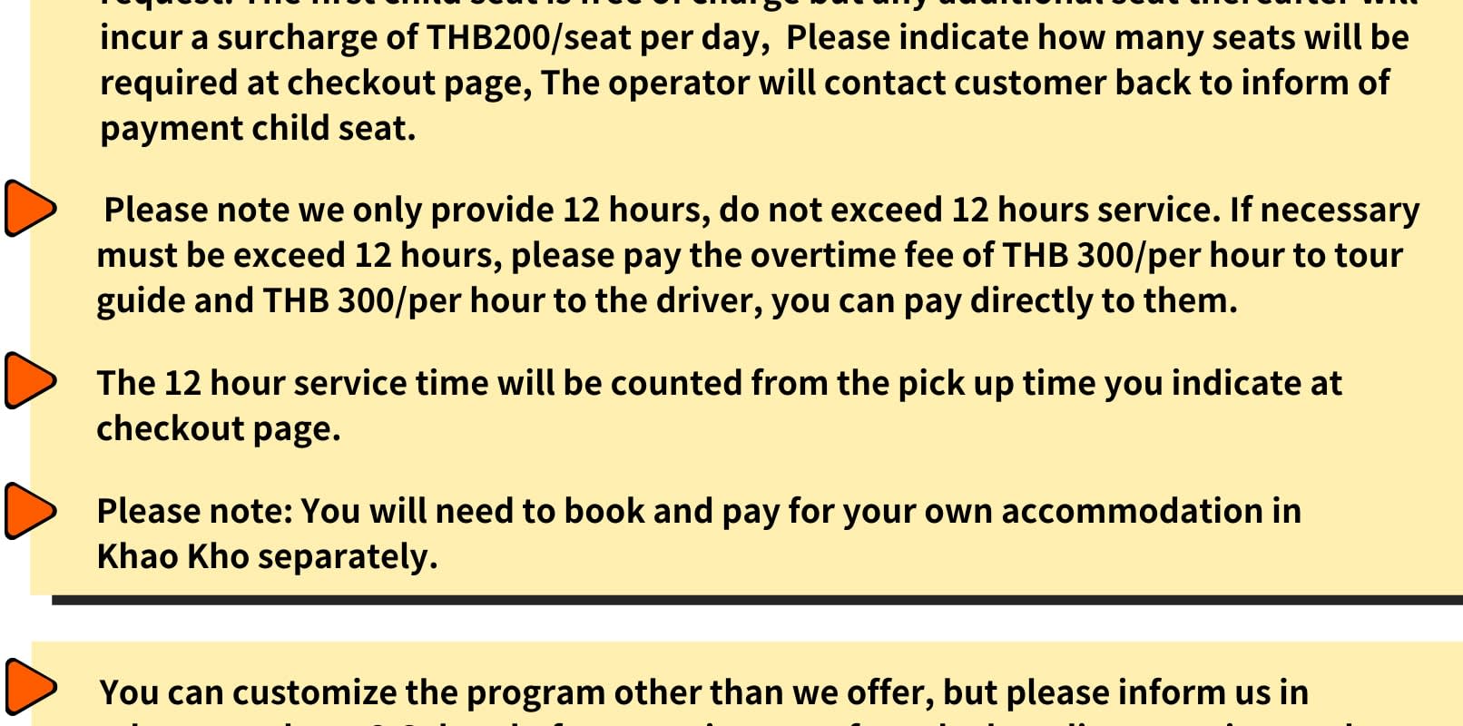 - 추가 요금: * 모든 추가 요금은 현금으로 운전기사에게 직접 지불해야 합니다. * 아동용 카시트: 좌석당 THB200 (아동용 카시트 1개 무료 제공) - 방콕 지역 픽업: * Phu Thap Buek: 차량당 THB1000 * Baht: 차량당 THB1200 * Lopburi: 차량당 THB500 - 초과 근무: * 오후 9시 1분부터 오전 8시 59분까지는 시간당 THB300의 초과 근무 수당이 부과됩니다.