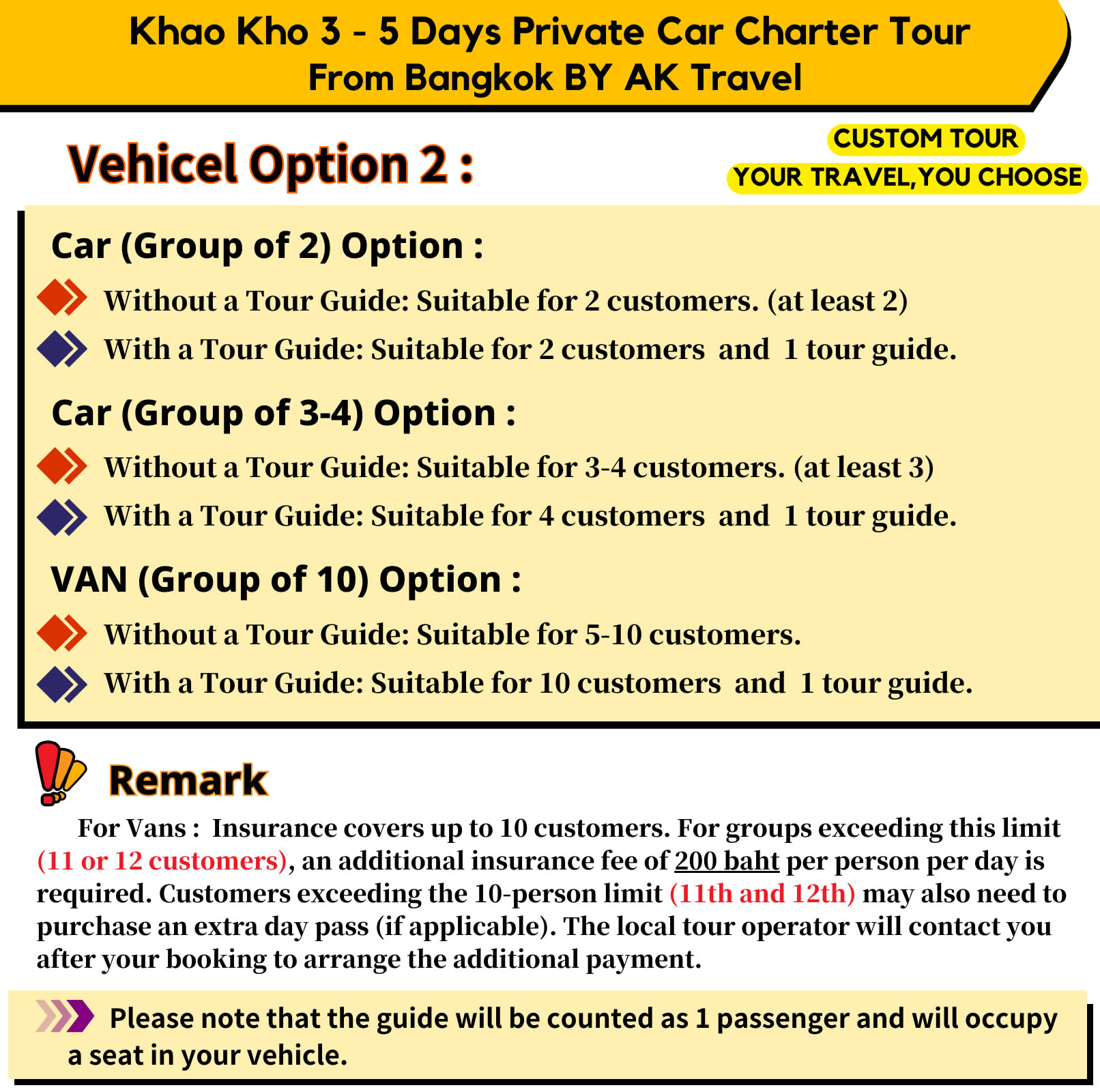 - 차량 옵션: * 스탠다드 세단:승객 3명; 표준 크기 수하물 최대 3개 수용 가능 * 스탠다드 MPV:승객 5명; 표준 크기 수하물 최대 5개 수용 가능 * 스탠다드 밴:승객 10명; 표준 크기 수하물 최대 7개 수용 가능 - 샘플 일정: * 본 일정은 참고용으로 제안된 일정입니다. - 3일 차량 대절 - 1일차 * 9:00am 방콕 출발 * 12:00pm Si Thep Historical Park 이동 * 2:00pm Phai Son Khao Restaurant 점심 식사 (개인경비) * 5:00pm Wat Phra Thart Pha Sorn Kaew 이동 * 7:00pm Krua Khao Kho 저녁 식사 (개인경비) * 8:30pm 호텔 복귀 - 2일차 * 9:00am 호텔 픽업 * 10:00am 180 Cafe 이동 * 11:30am Mountain Wind Farm 이동 * 12:30pm GB Farm 방문 * 2:30pm Boranniyom Khao Kho Restaurant 점심 식사 (개인경비) * 4:00pm Kanchanapisek Pagoda 이동 * 5:00pm Khao Khao Post Office 이동 * 6:30pm Chaylongbay Cafe 저녁 식사 (개인경비) * 7:30pm 호텔 복귀 - 3일차 * 9:00am 호텔 픽업 * 9:30am Pino Latte Cafe 이동 * 1:00pm New Bua Tong Restaurant 점심 식사 (개인경비) * 2:00pm 방콕으로 출발 * 6:30pm 방콕의 한 레스토랑에서 저녁 식사 (개인경비) * 9:00pm 방콕 호텔 드롭 - 4일 차량 대절 - 1일차 * 9:00am 방콕 출발 * 12:00pm Si Thep Historical Park 이동 * 2:00pm Phai Son Khao Restaurant 점심 식사 (개인경비) * 5:00pm Wat Phra Thart Pha Sorn Kaew 이동 * 7:00pm Krua Khao Kho 저녁 식사 (개인경비) * 8:30pm 호텔 복귀 - 2일차 * 9:00am 호텔 픽업 * 10:00am 180 Cafe 이동 * 11:30am Mountain Wind Farm 이동 * 12:30pm GB Farm 방문 * 2:30pm Boranniyom Khao Kho Restaurant 점심 식사 (개인경비) * 4:00pm Kanchanapisek Pagoda 이동 * 5:00pm Khao Khao Post Office 이동 * 6:30pm Chaylongbay Cafe 저녁 식사 (개인경비) * 7:30pm 호텔 복귀 - 3일차 * 9:00am 호텔 픽업 * 10:00am Takmoh Cafe 이동 * 12:00pm Le Kuad SteakHouse 점심 식사 (개인경비) * 2:30pm 농장으로 이동 * 4:00pm Weapon Museum 이동 * 5:00pm Khao Khao Memorial 이동 * 6:30pm KhunAew Restaurant 저녁 식사 (개인경비) * 8:30pm 호텔 복귀 - 4일차 * 9:00am 호텔 픽업 * 9:30am Pino Latte Cafe 이동 * 1:00pm New Bua Tong Restaurant 점심 식사 (개인경비) * 2:00pm 방콕으로 출발 * 6:30pm 방콕의 한 레스토랑에서 저녁 식사 (개인경비) * 9:00pm 호텔 복귀 - 5일 차량 대절 - 1일차 * 9:00am 방콕 출발 * 12:00pm Si Thep Historical Park 이동 * 2:00pm Phai Son Khao Restaurant 점심 식사 (개인경비) * 5:00pm Wat Phra Thart Pha Sorn Kaew 이동 * 7:00pm Krua Khao Kho 저녁 식사 (개인경비) * 8:30pm 호텔 복귀 - 2일차 * 9:00am 호텔 픽업 * 10:00am 180 Cafe 이동 * 11:30am Mountain Wind Farm 이동 * 12:30pm GB Farm 방문 * 2:30pm Boranniyom Khao Kho Restaurant 점심 식사 (개인경비) * 4:00pm Kanchanapisek Pagoda 이동 * 5:00pm Khao Khao Post Office 이동 * 6:30pm Chaylongbay Cafe 저녁 식사 (개인경비) * 7:30pm 호텔 복귀 - 3일차 * 9:00am 호텔 픽업 * 10:00am Takmoh Cafe 이동 * 12:00pm Le Kuad SteakHouse 점심 식사 (개인경비) * 2:30pm 농장으로 이동 * 4:00pm Weapon Museum 이동 * 5:00pm Khao Khao Memorial 이동 * 6:30pm KhunAew Restaurant 저녁 식사 (개인경비) * 8:30pm 호텔 복귀 - 4일차 * 9:00am 호텔 픽업 * 10:00am Pino Latte Cafe 이동 * 12:30pm Malee Restaurant 점심 식사 (개인경비) * 2:00pm Sri Dit Waterfall 이동 * 3:00pm Khao Khao Palace 이동 * 5:00pm Jolly Cafe Khao-Kho 이동 * 7:00pm Klin Kao Rai Restaurant 저녁 식사 (개인경비) * 8:30pm 호텔 복귀 - 5일차 * 9:00am 호텔 픽업 * 9:30am Route 12 Cafe 이동 * 1:00pm New Bua Tong Restaurant 점심 식사 (개인경비) * 2:00pm 방콕으로 복귀 * 6:30pm 방콕의 한 레스토랑에서 저녁 식사 (개인경비) * 9:00pm 호텔 복귀