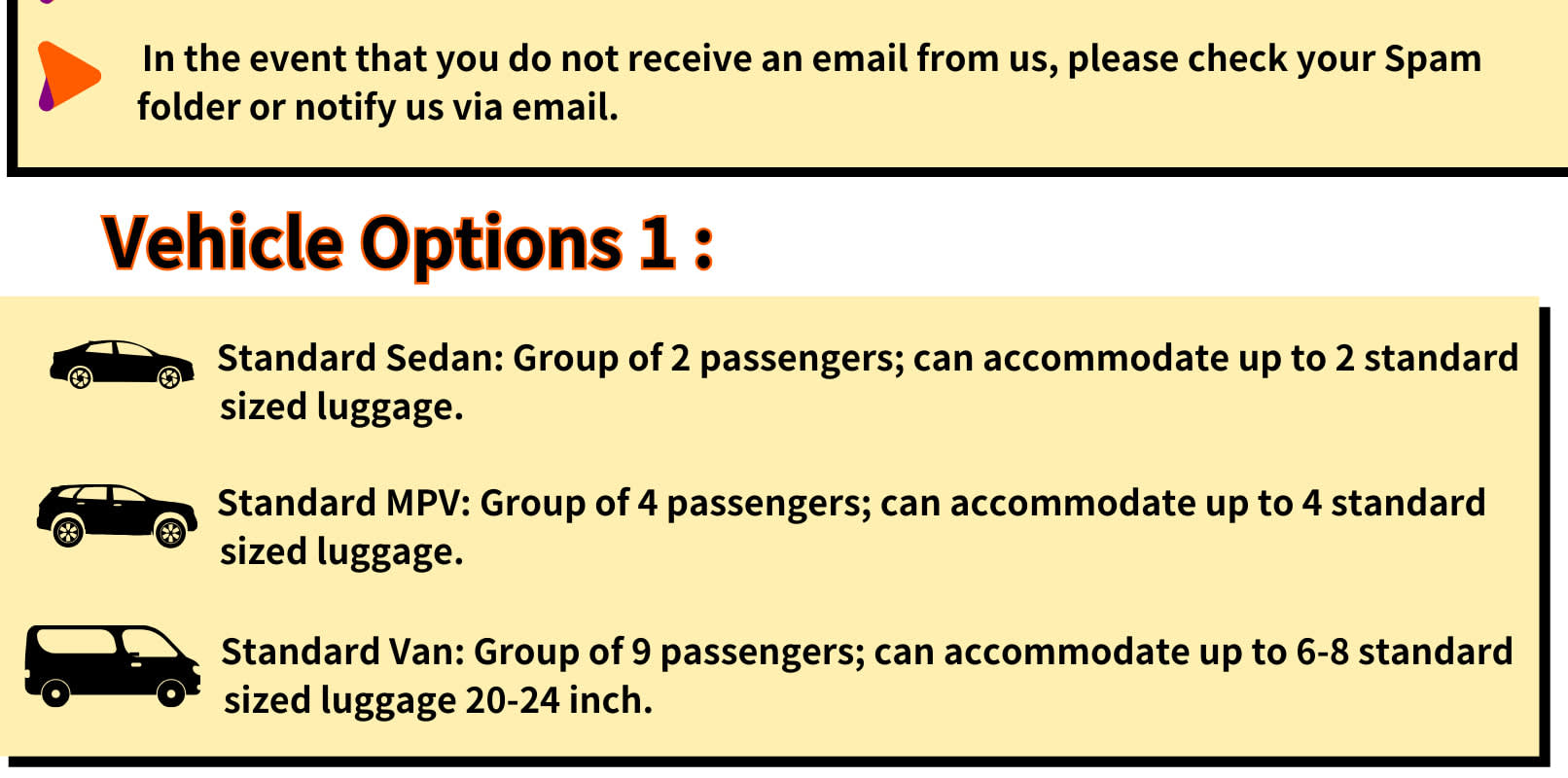 - 추가 정보: * 운영 시간: 9:00am-9:00pm * 유아 및 아동은 승객 수에 포함되어야 합니다. * 아동용 카시트는 요청 시 이용 가능합니다. * 차량은 유모차 및 휠체어 이용이 불가능합니다. * 냄새가 강한 품목을 제외하고 음식과 음료는 차량 내에서 허용됩니다. * 허용되는 표준 수하물 크기는 22" x 14" x 9"입니다. 큰 가방은 2개로 간주됩니다. * 애완동물은 차량 내에 데려올 수 없습니다. * 서핑보드 및 골프 가방과 같은 큰 물품은 실을 수 없습니다.