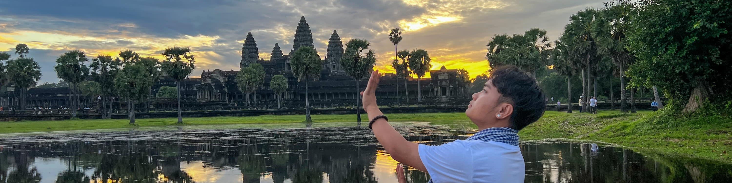 • 새벽 일찍 픽업 차량을 타고 세계 최대의 종교 기념물인 앙코르와트에서 눈부신 일출을 감상하세요. 90분 동안 이 상징적인 사원의 건축물을 탐험하고 잊지 못할 사진을 찍어보세요. 해가 떠오르며 탑을 비추는 모습을 감상하고 현지 승려에게 축복을 받아보세요. 이후 가족이 운영하는 레스토랑에서 현지 조식으로 하루를 시작하세요. 앙코르 사원 근처의 친절한 시골 마을인 프레아닥 마을에서 시골 생활을 경험해보세요. 전통 야자 케이크를 맛보고 현지인들을 만나보세요. 반테아이 크데이, 승리의 문, 프라삿 클레앙 사원, 프라삿 프레아 팔릴라이와 같은 멋진 사원을 계속 방문하세요. 타 프롬 사원을 감싸고 있는 사진 촬영 명소인 나무 뿌리에 감탄해보세요. 54개의 탑과 216개의 아발로키테스바라의 얼굴로 유명한 바이욘과 바푸온에서 투어를 마무리합니다.