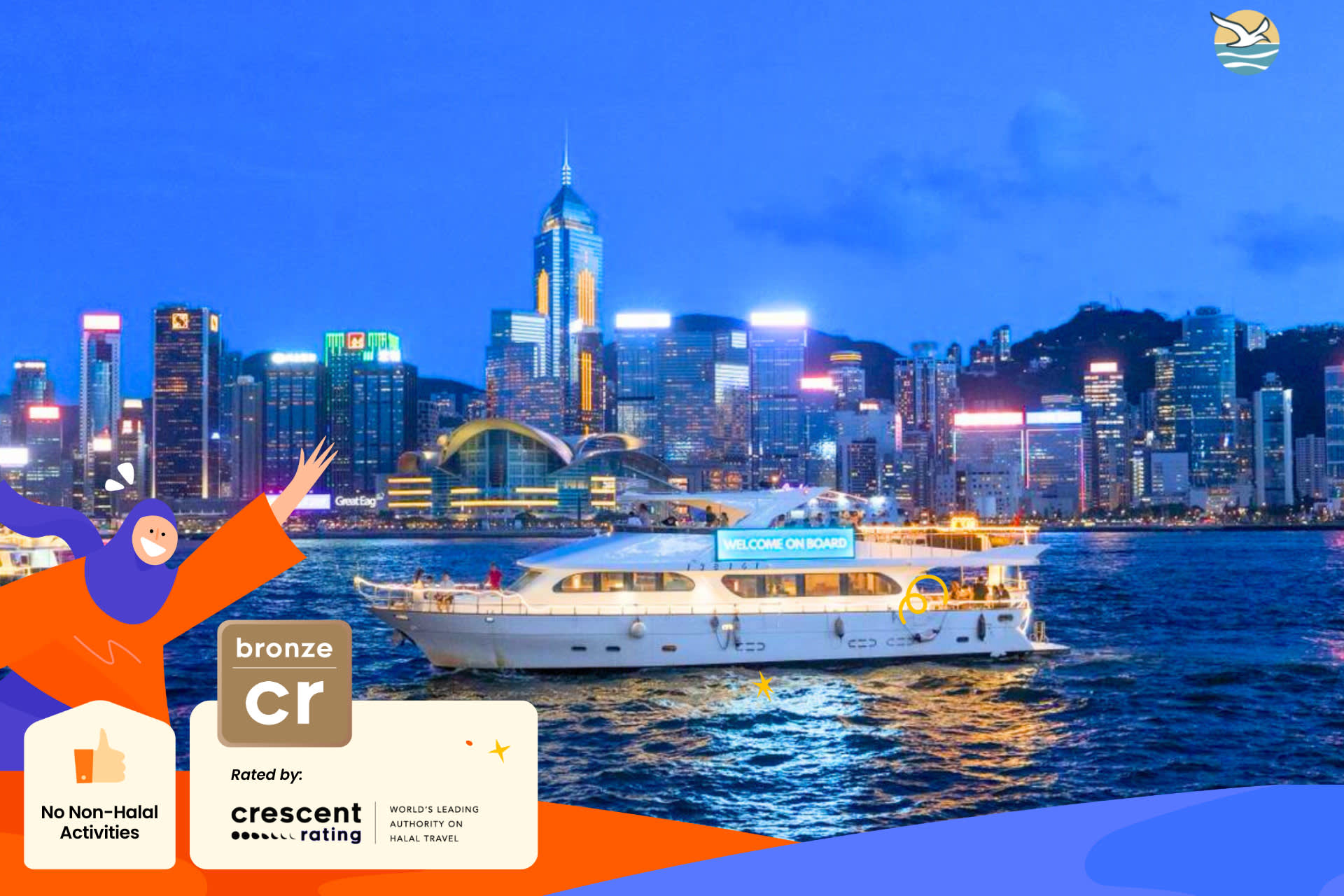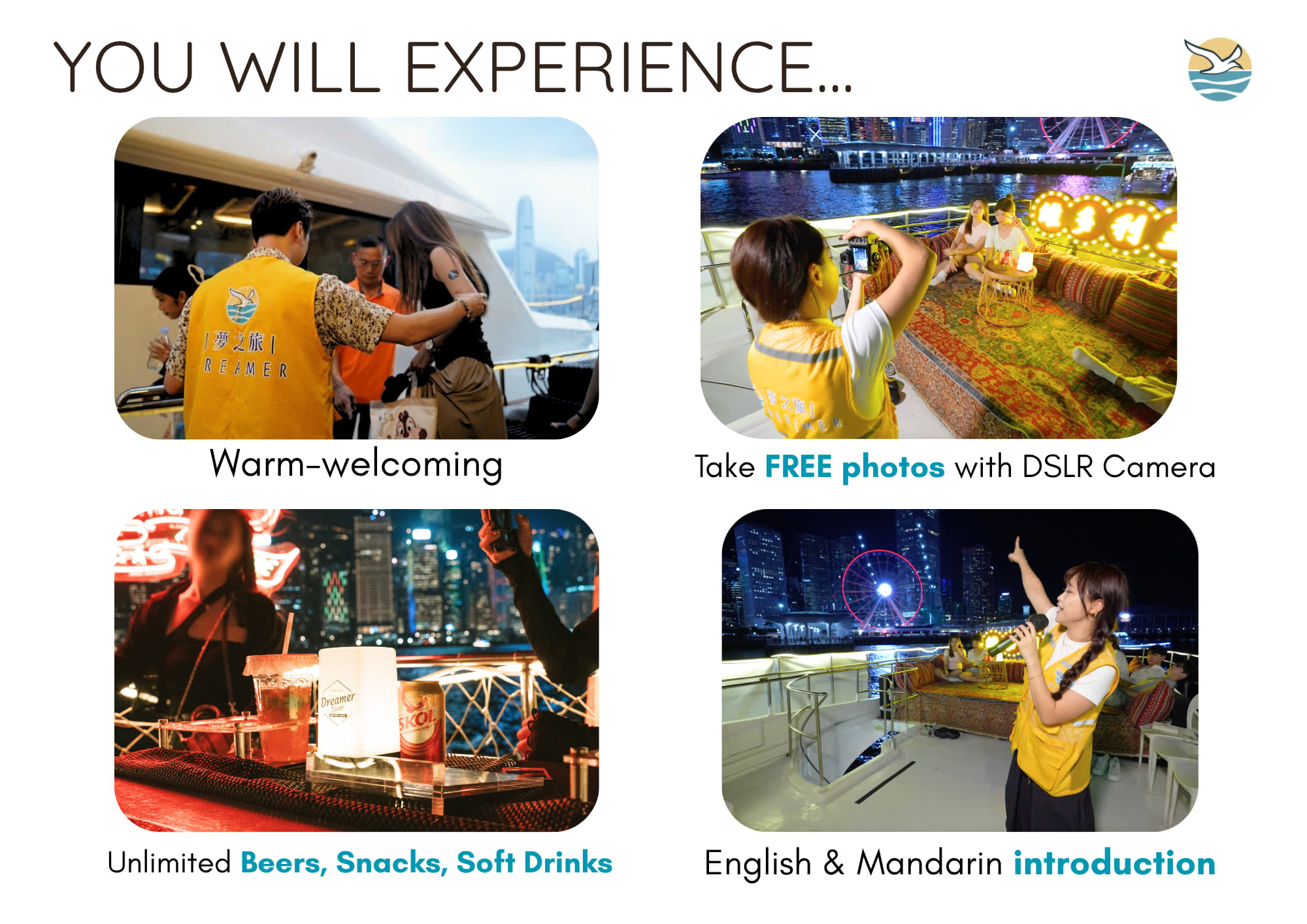 ▶【34% 할인】 마법 같은 석양을 만끽하는 시간: 17:00/17:20/17:35 - 이용요건 * 만 0-18세는 반드시 티켓을 소지한 성인을 동반해야 합니다. * 만 0-2세는 무료로 본 액티비티에 참여할 수 있습니다. * 만 0-18세는 알코올 음료를 이용할 수 없습니다. * 아동 티켓: 만 3-12세 * 시니어 티켓: 만 65세 이상 - 추가정보 * 멀미를 하시는 경우, 액티비티 1시간 전 멀미약을 복용하실 것을 권장합니다. * 황색/적색 폭우 경보 또는 태풍 1호가 발령되면 Dreamer 크루즈는 정상 운영됩니다. 열대성 폭풍 경고 신호 3호가 계속 발령되거나 흑색 폭우 경보가 예약된 픽업 시간 2시간 전에 발령되면 Dreamer 크루즈는 휴장합니다. 고객은 환불 또는 일정 변경을 요청할 수 있습니다. 크루즈 운항 중 열대성 폭풍 경보 3호가 발령되거나 흑색 폭우 경보가 발령되면 안전을 위해 즉시 출발 지점으로 돌아갑니다. * 예약 시 안내된 시간 및 장소에서 탑승해 주시기 바랍니다. 잘못된 장소에 도착하는 경우 탑승이 불가능할 수 있습니다. 탑승 장소 또는 시간을 변경해야 하는 경우 사전에 고객 서비스 센터로 문의하시기 바랍니다. - 규정 및 제한사항 * 외부 음식물 반입은 불가합니다. - 편의성/접근성 * 휠체어 이용이 불가합니다.