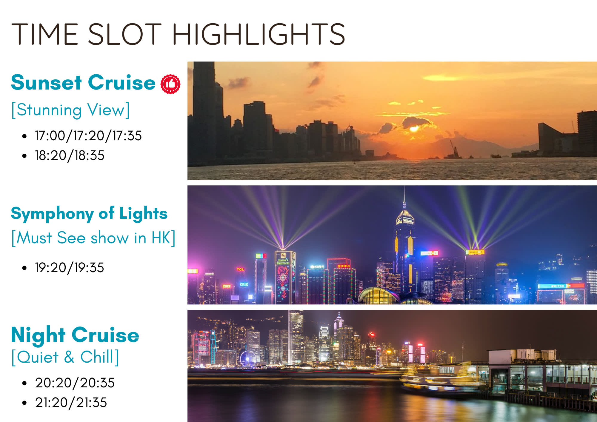 확정된 시간과 장소를 선택하신 후, 지정된 장소로 이동하여 크루즈에 탑승해 주시기 바랍니다. 노스 포인트의 탑승 장소는 노스 포인트 페리 부두가 아닌 노스 포인트 공공 부두이며, 센트럴의 탑승 장소는 센트럴 9호 부두 5번이고, 침사추이의 탑승 장소는 구룡 침사추이 공공 부두 2번입니다.