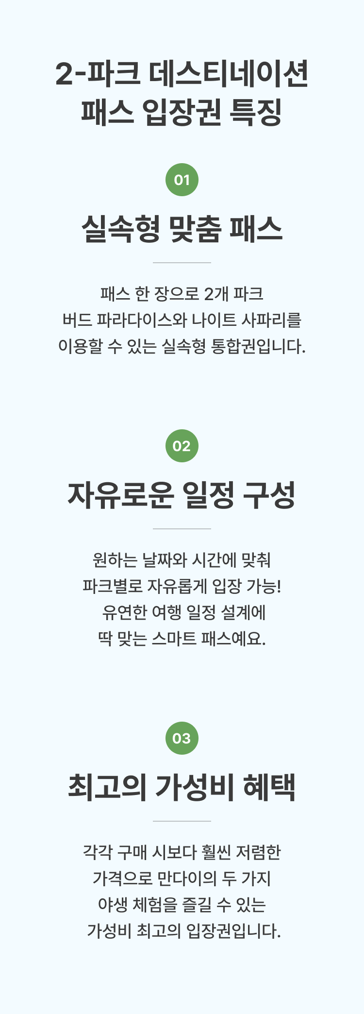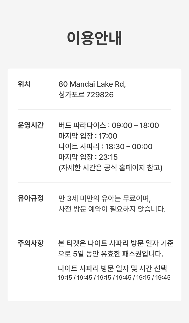 🐯 공원 입장 및 예약 안내 필수 예약 정보 예약 시, 나이트 사파리 방문 날짜와 시간을 반드시 선택해 주셔야 합니다. 선택하신 날짜와 시간에만 입장이 가능합니다. 티켓 유효 기간 및 포함 사항 선택하신 시작일로부터 5일간 유효합니다. 선택하신 조합에 포함된 각 공원에 1회씩 입장할 수 있습니다. 버드 파라다이스, 나이트 사파리 입장 시 트램 탑승이 포함되어 있습니다. 연령별 입장 안내 3세 미만: 무료 입장이 가능하며, 연령 확인을 위해 신분증 제시가 필요합니다. 12세 미만 아동: 유료 입장권을 소지한 보호자와 반드시 동반해야 합니다. 취소 및 변경 규정 예약 완료 후에는 취소 또는 변경이 불가하오니 신중하게 결정해 주시기 바랍니다. ⚠️ 안전 수칙 및 공원 규칙 동물들에게 영향을 줄 수 있으므로, 향수나 강한 향이 나는 제품 사용을 자제해 주세요. 동물에게 먹이를 주거나, 만지거나, 놀리는 행위는 금지되어 있습니다. 동물들의 스트레스 방지를 위해 플래시를 이용한 촬영은 금지됩니다.