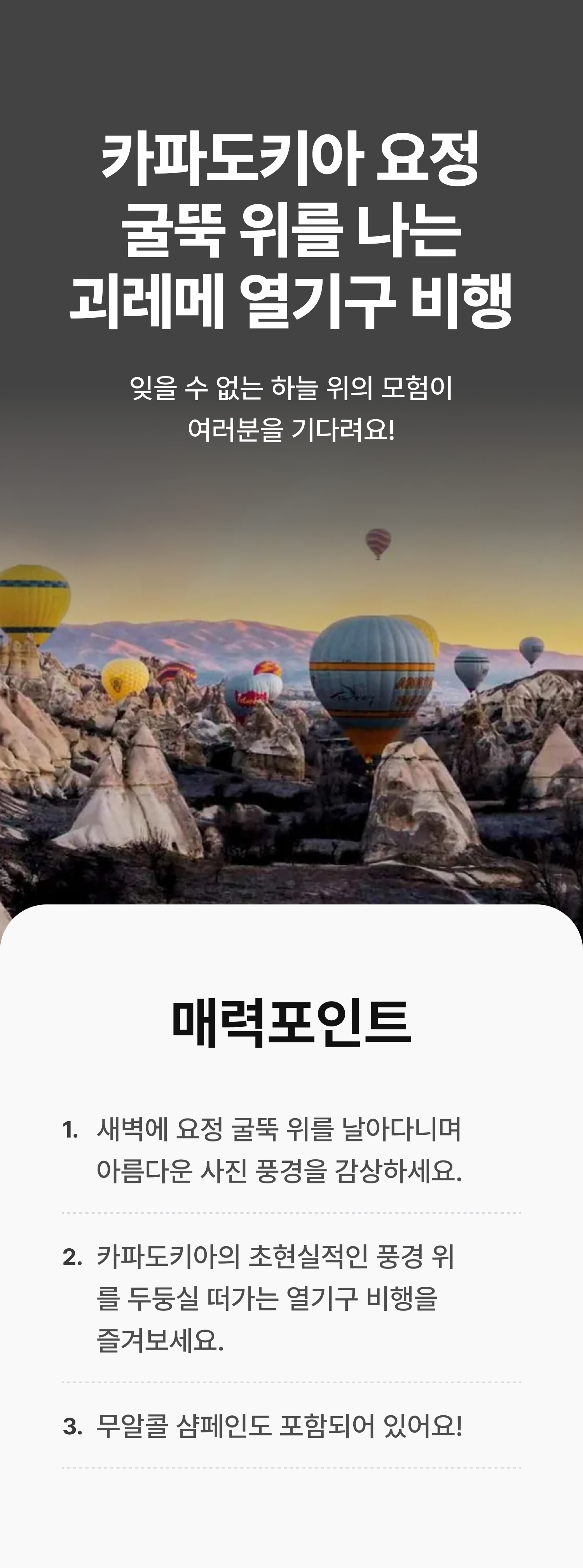 카파도키아 상공 열기구 탑승은 단순한 여행 그 이상의 버킷리스트 경험으로 평생 간직할 수 있을 것입니다. 이 모험을 여러분과 함께 나누고 싶습니다!"