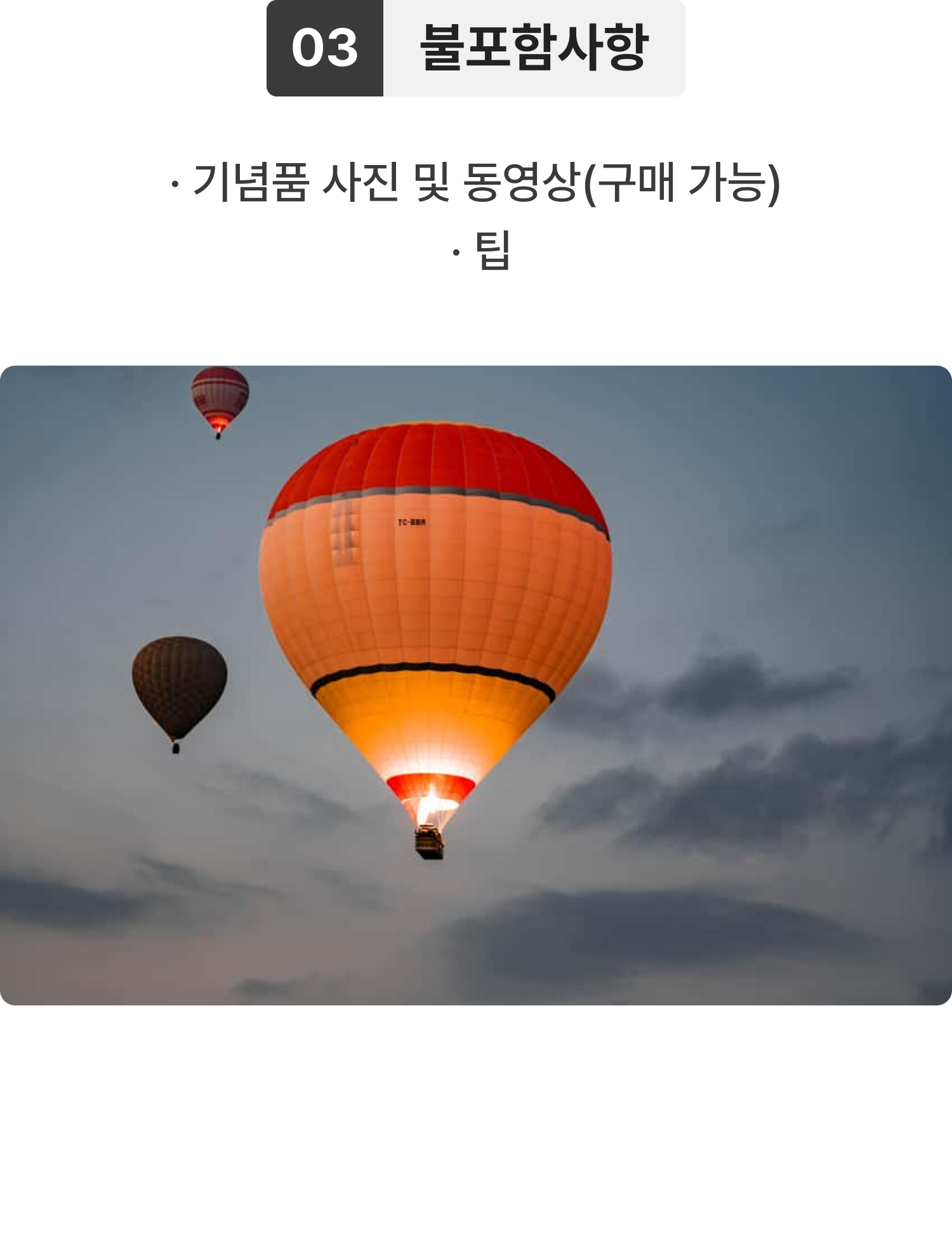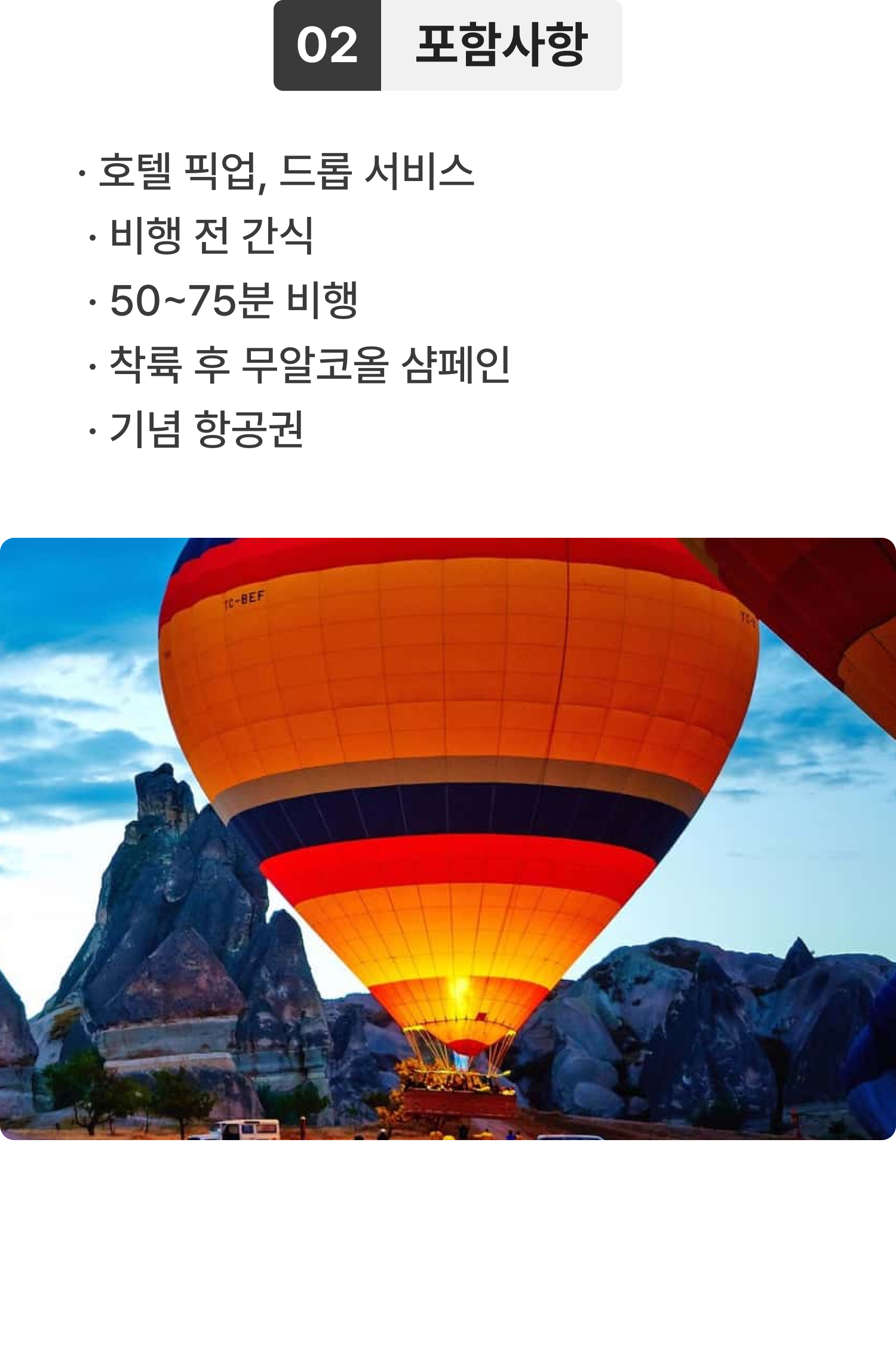 아침 날씨가 추울 수 있으니 재킷을 준비하세요. 모든 비행은 오전에 진행되지만 일출 비행은 보장할 수 없습니다. 액티비티 제공자는 일출과 일출 후 약 15분에서 30분 후에 시작하는 두 가지 유형의 아침 비행을 제공합니다. 이러한 비행 시간 배정은 운영상의 고려 사항에 따라 달라질 수 있으며 사전에 보장할 수 없습니다. * 소요시간 : 3.5시간 (옵션에 따라 소요 시간이 다를 수 있으니, 예약 시 확인 부탁드립니다.)