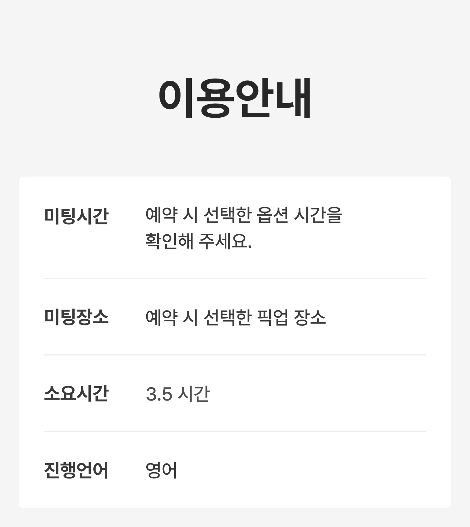 ● 예약접수 후 확정이 되면 이용가능합니다. ● 바우처에 안내된 사용 방법을 확인한 후 이용해 주시기 바랍니다. ● 48시간 이내에 바우처를 받지 못하신 경우 고객센터로 문의해 주시기 바랍니다.