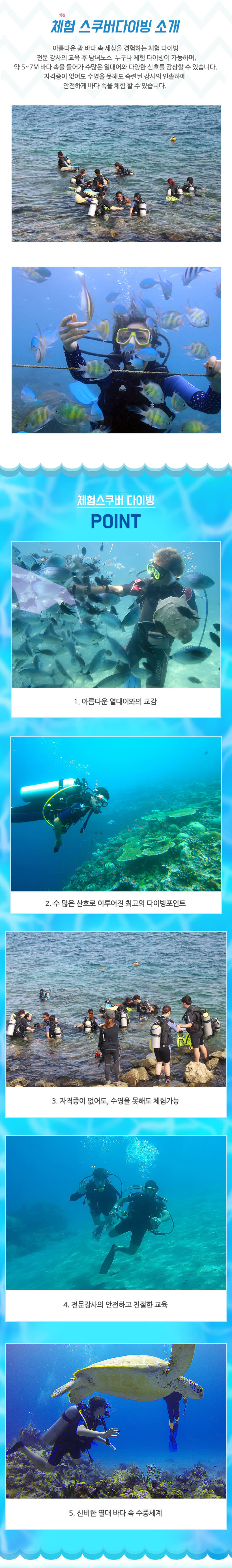 체험 다이빙은 스쿠버다이빙을 처음 접하시는 분들을 위해 만들어진 상품으로 본인의 수영 실력과는 전혀 상관없으며, 당일 한국인 강사님으로부터 간단한 이론 교육 및 안전 교육을 받은 후 안전하게 이용하실 수 있습니다.
