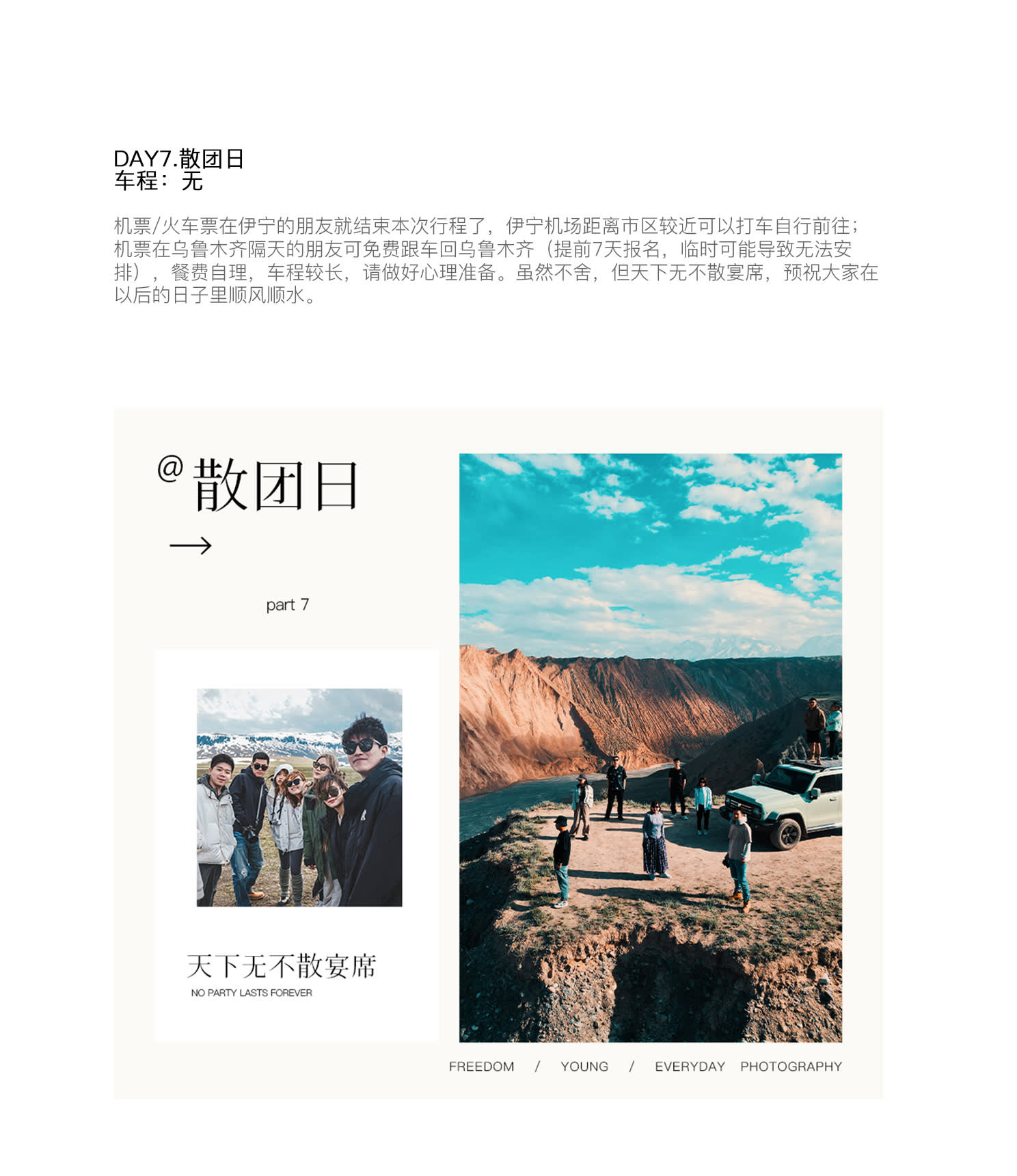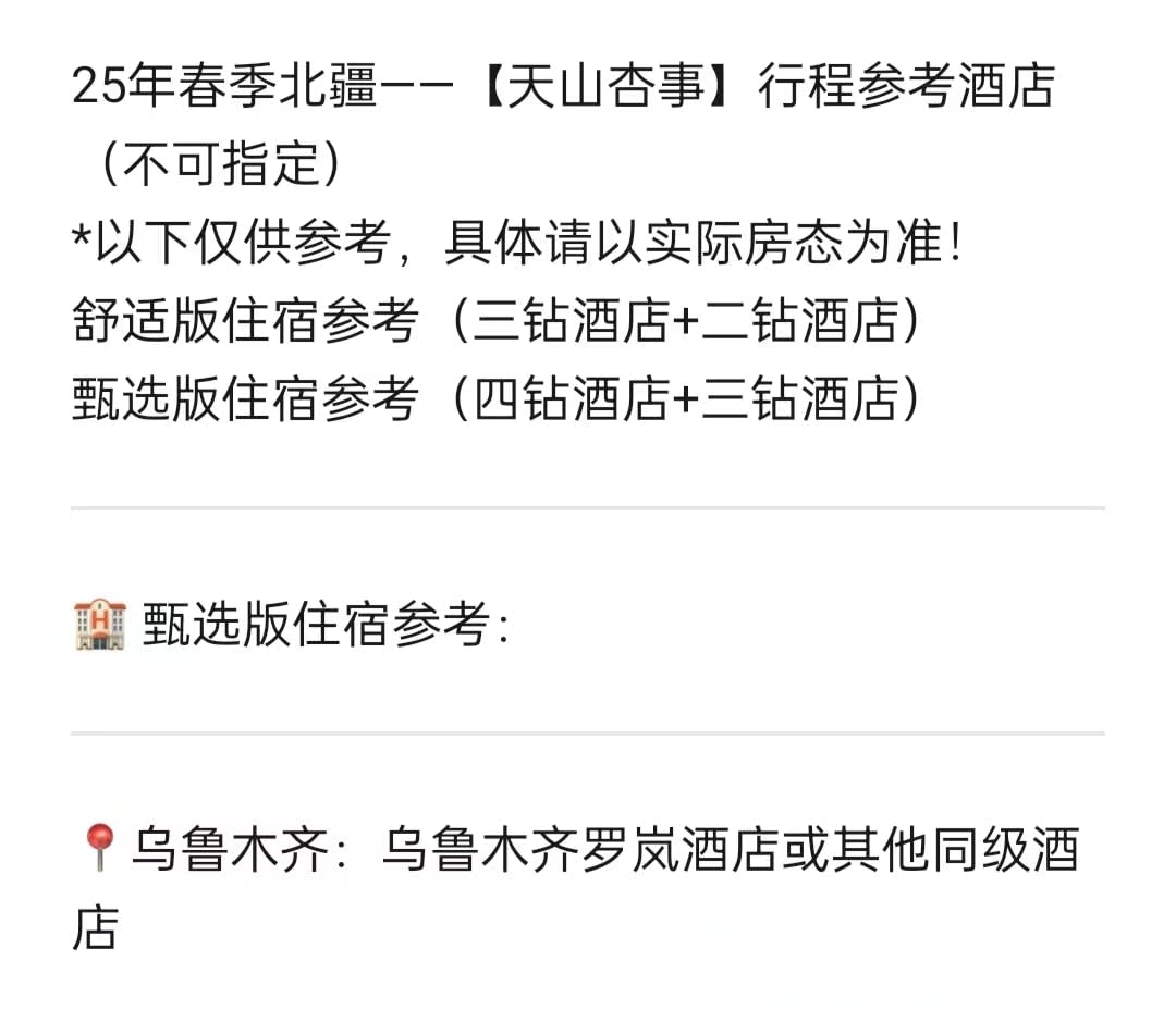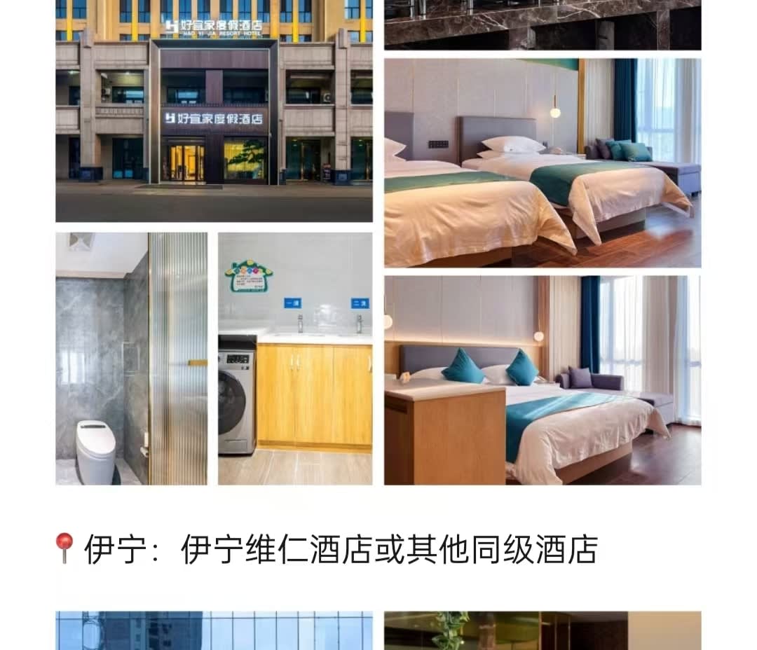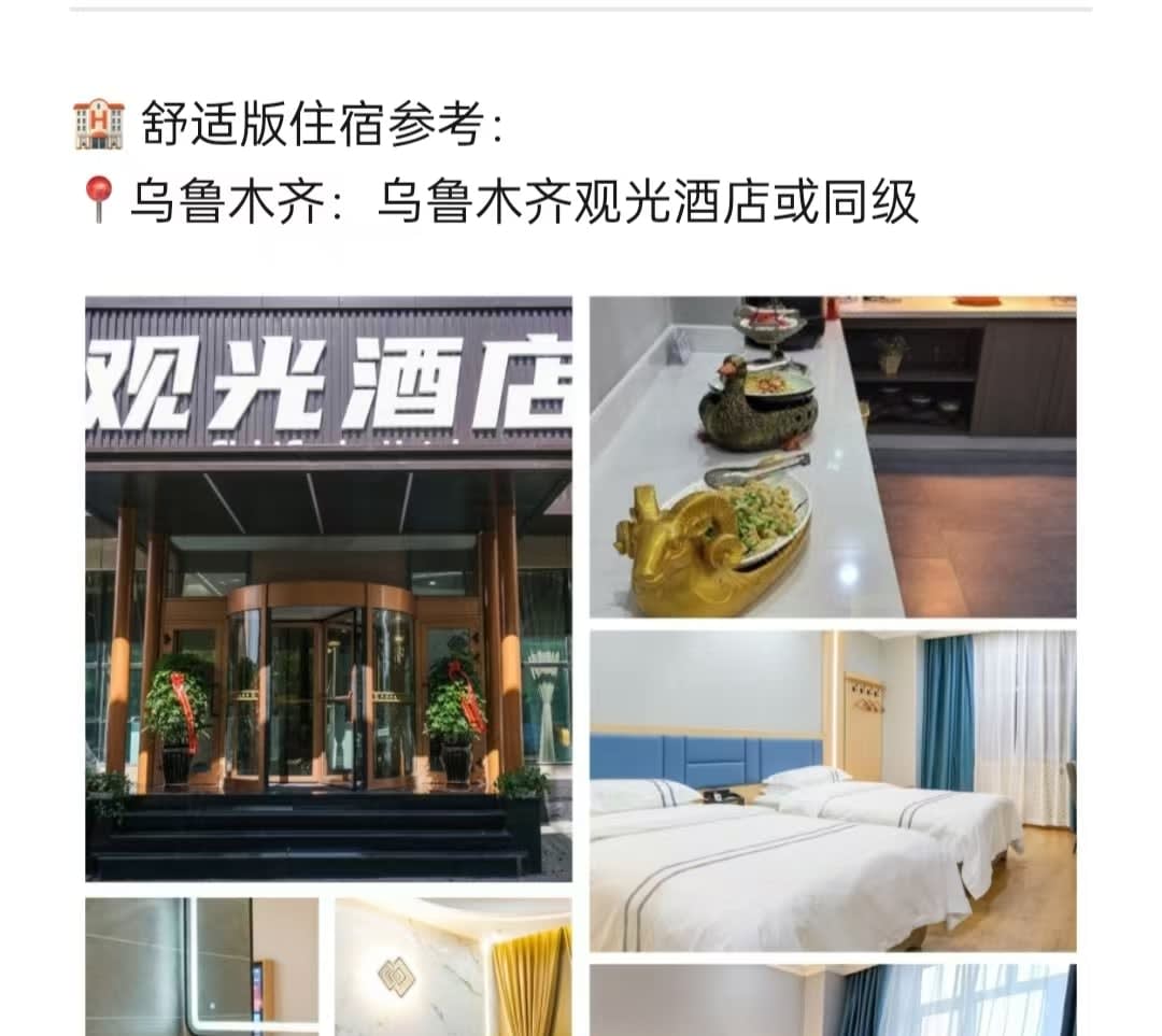 * 1. 항공편 정보 구매 관련: 집합일 당일 항공편 구매를 권장하며, 집합일에 우루무치에 도착하면 됩니다. * 항공편 정보 구매 관련: 집합일 당일 항공편 구매를 권장하며, 집합일에 우루무치에 도착하면 됩니다. * 1. 해산 시간 관련: 이닝에서 해산합니다. 우루무치에서 다음날 항공편을 이용하는 경우, 우루무치까지 무료로 차량을 이용할 수 있습니다(7일 전 신청, 임박 시 예약이 불가능할 수 있음). 식비는 개별 부담이며, 차량 이동 시간이 길기 때문에 미리 대비하시기 바랍니다. 날씨, 교통 체증, 교통 통제 등 기타 불가항력적인 요인으로 인해 우루무치에 도착하지 못할 경우, 여행사는 추가 비용을 부담하지 않습니다. * 해산 시간 관련: 이닝에서 해산합니다. 우루무치에서 다음날 항공편을 이용하는 경우, 우루무치까지 무료로 차량을 이용할 수 있습니다(7일 전 신청, 임박 시 예약이 불가능할 수 있음). 식비는 개별 부담이며, 차량 이동 시간이 길기 때문에 미리 대비하시기 바랍니다. 날씨, 교통 체증, 교통 통제 등 기타 불가항력적인 요인으로 인해 우루무치에 도착하지 못할 경우, 여행사는 추가 비용을 부담하지 않습니다. * 1. 예약 시 기본적으로 스탠다드룸으로 예약되며, 공휴일 등으로 인해 호텔 스탠다드룸이 부족할 경우, 사전에 안내 후 더블룸 또는 다른 유형의 객실로 업그레이드될 수 있습니다. 호텔 만실, 정전, 단수 또는 정부 행사 등 불가항력적인 요인이 발생할 경우, 다른 호텔로 조정될 수 있습니다. * 예약 시 기본적으로 스탠다드룸으로 예약되며, 공휴일 등으로 인해 호텔 스탠다드룸이 부족할 경우, 사전에 안내 후 더블룸 또는 다른 유형의 객실로 업그레이드될 수 있습니다. 호텔 만실, 정전, 단수 또는 정부 행사 등 불가항력적인 요인이 발생할 경우, 다른 호텔로 조정될 수 있습니다. * 1. 예약 시 기본 차량은 탱크300 SUV이며, 1인으로 그룹에 합류하는 경우, 예약 시간에 따라 차량/객실 합승이 진행되며, 좌석은 자유롭게 조정할 수 있습니다. * 예약 시 기본 차량은 탱크300 SUV이며, 1인으로 그룹에 합류하는 경우, 예약 시간에 따라 차량/객실 합승이 진행되며, 좌석은 자유롭게 조정할 수 있습니다.