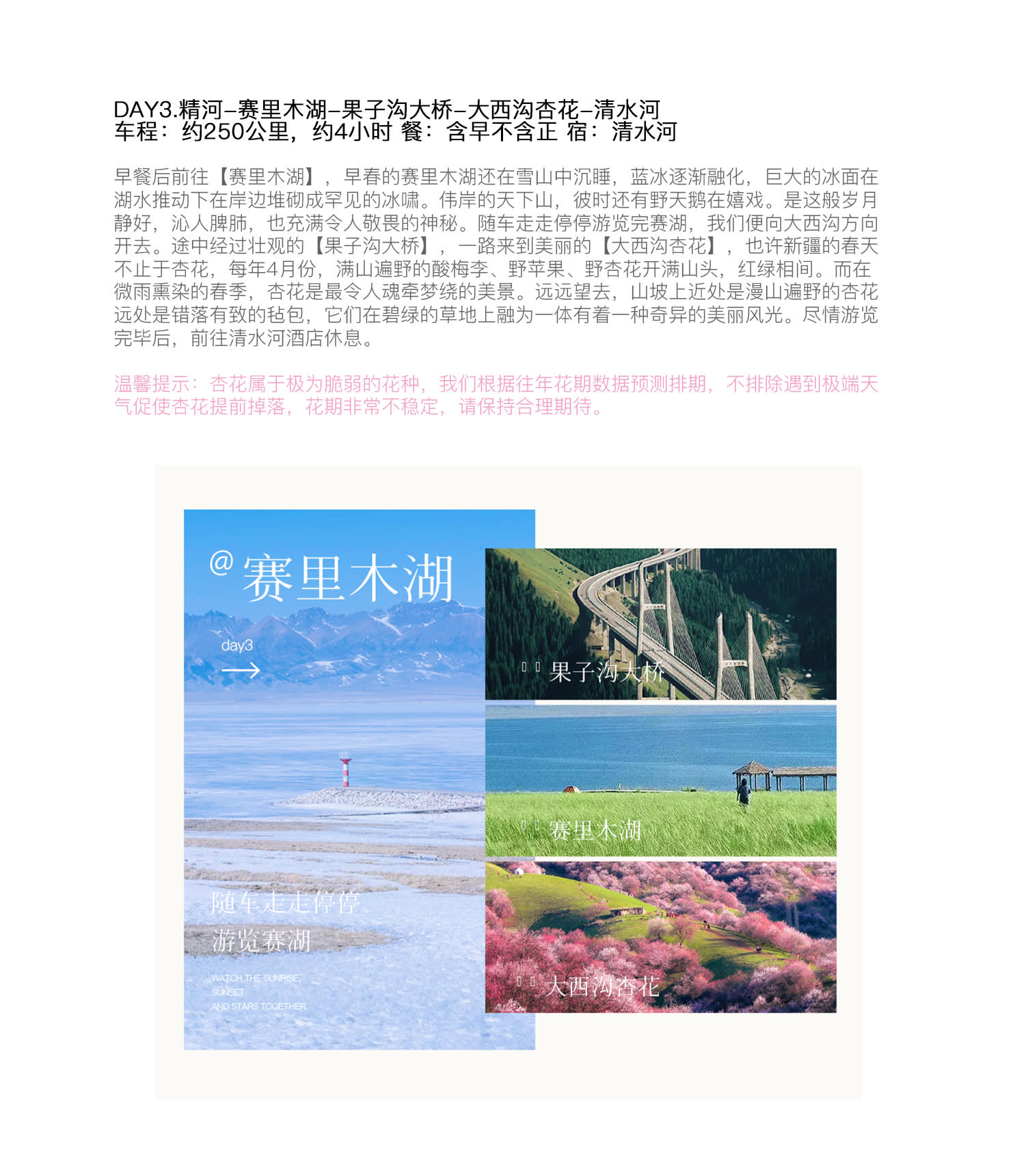 * DAY3 징허 - 사이리무 호수 - 과자거우 대교 - 다시거우 살구꽃 - 칭수이허 (250km, 약 4시간)