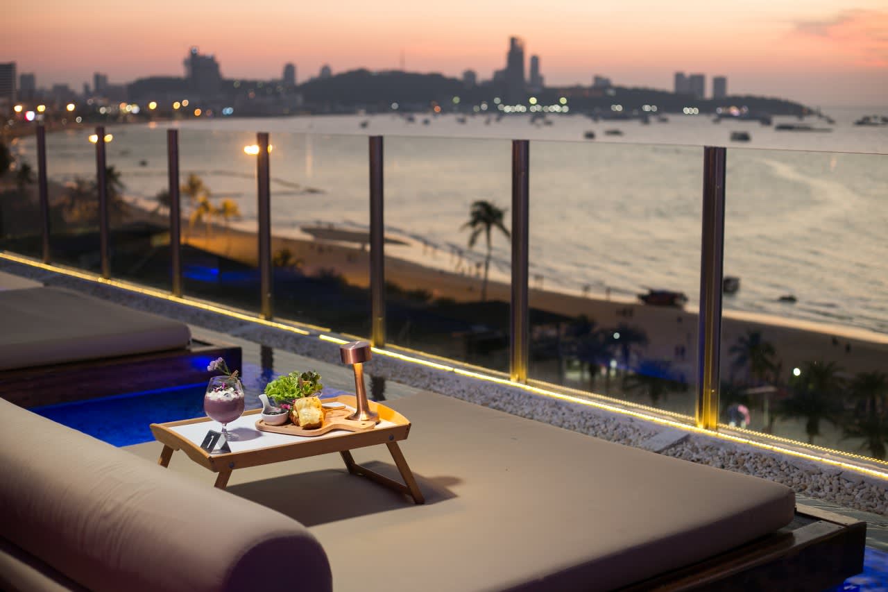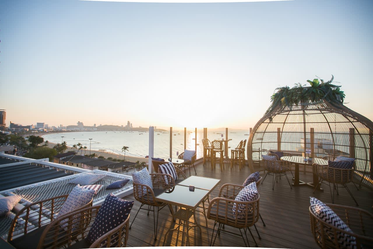 칵테일, 일몰, 파타야의 탁 트인 전경을 감상할 수 있는 세련된 해변 루프탑입니다.