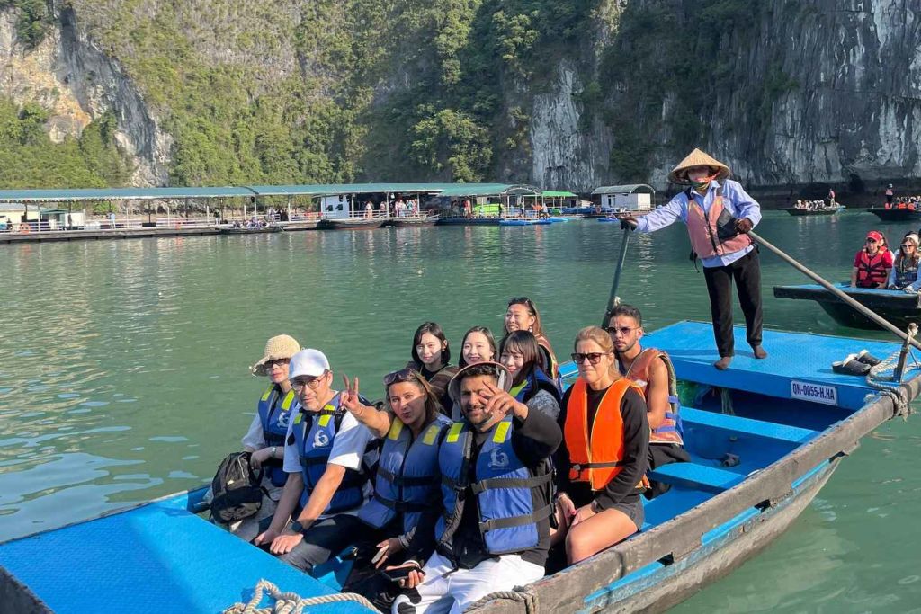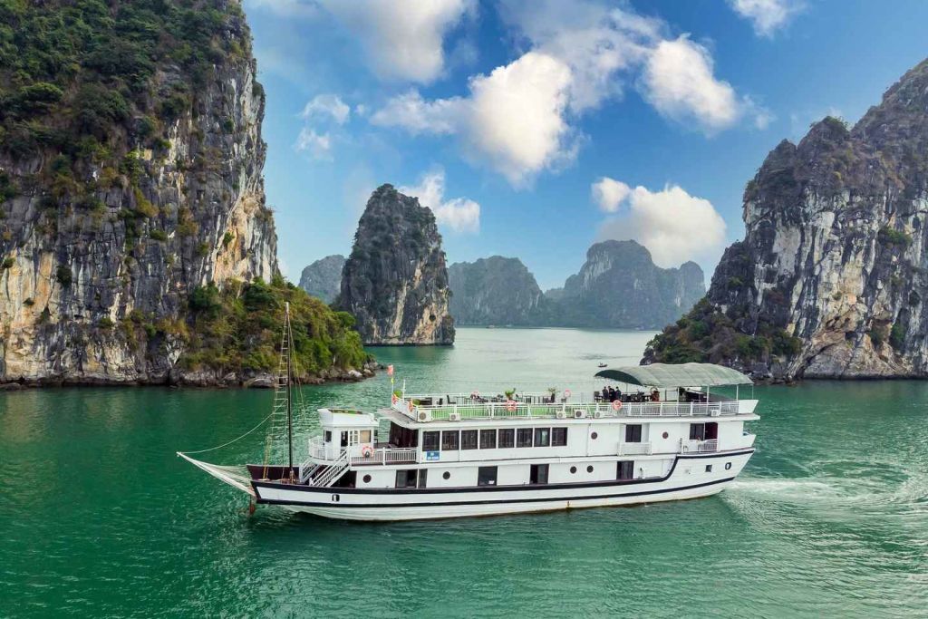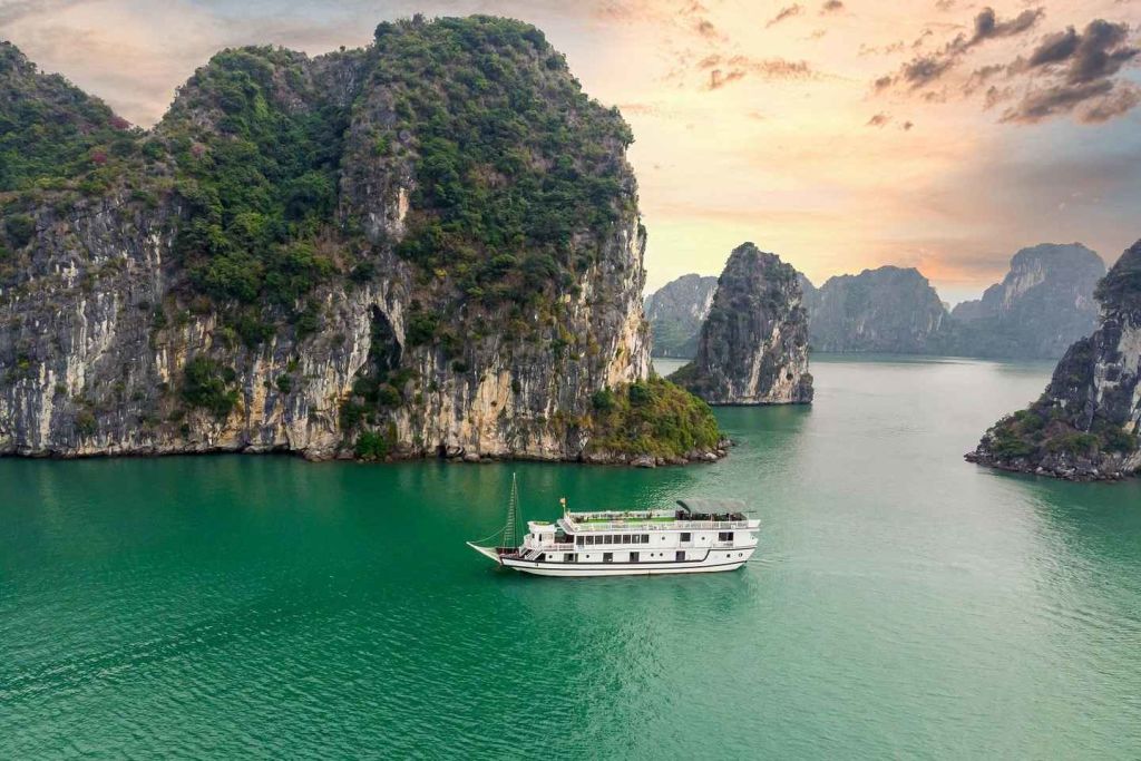 자리를 잡으면 웅장한 하롱베이에서 크루즈를 즐기며 점심을 먹습니다. 성솟 동굴을 향해 떠다니면서 매혹적인 기암괴석을 감상하세요. 그런 다음 보트에서 내려 멋진 전망과 해변에서 수영할 수 있는 장소로 유명한 티탑 섬을 둘러보세요.