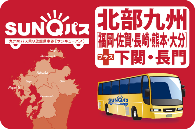 SUNQ 패스는 큐슈 섬 내 및 야마구치현 시모노세키시/나가토시 주변의 고속버스와 일반 노선버스 거의 모든 노선, 그리고 일부 선박을 무제한으로 이용할 수 있는 자유 이용 승차권입니다. 이용 가능한 버스 노선 수는 약 2,400개에 달하며, 큐슈 내 이동은 이 승차권 하나로 해결할 수 있습니다.