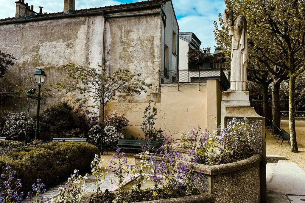 몽마르트르에 이름을 붙인 전설적인 인물을 기리는 생 드니 동상이 서 있는 평화로운 정원을 방문하세요.