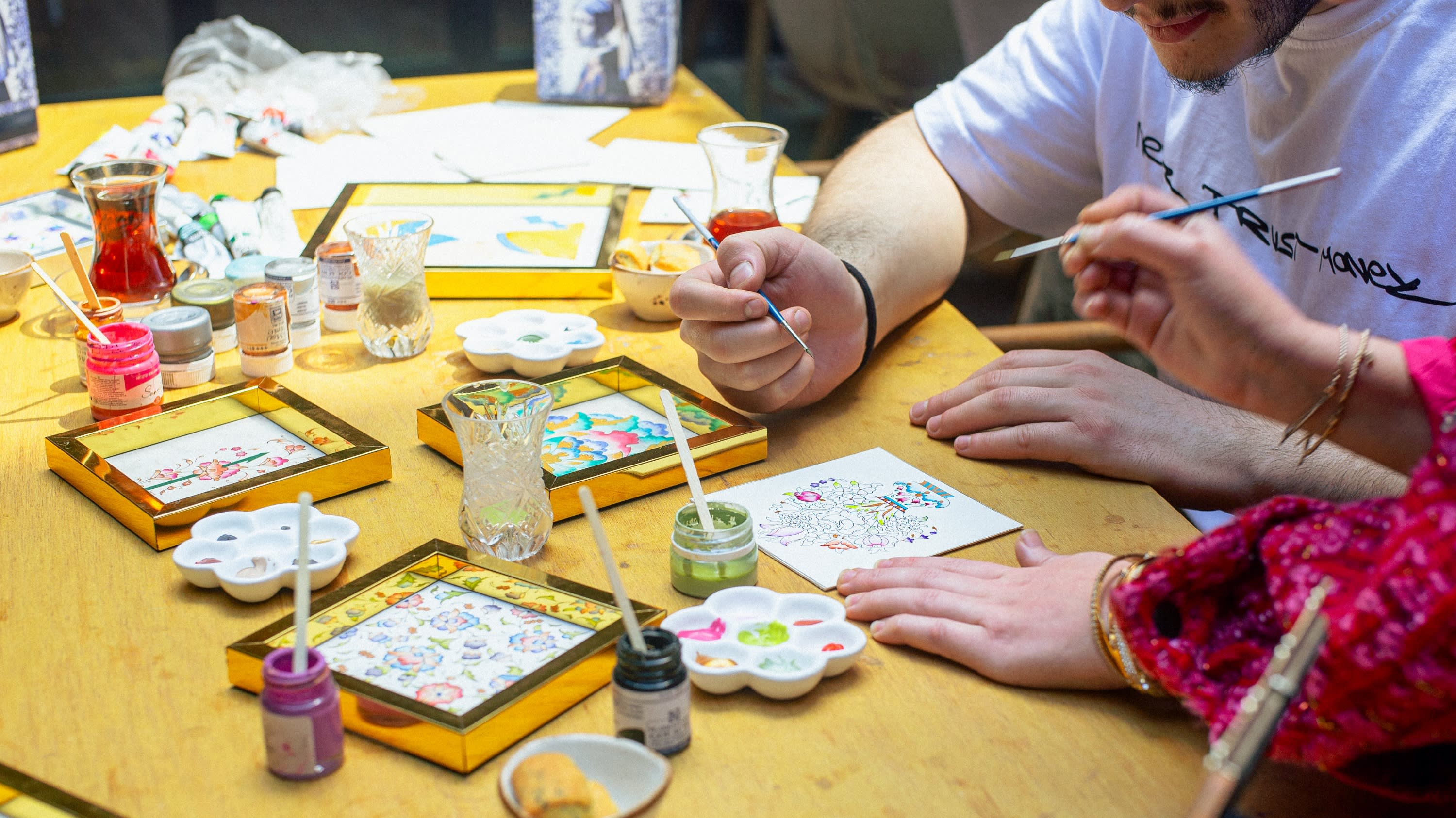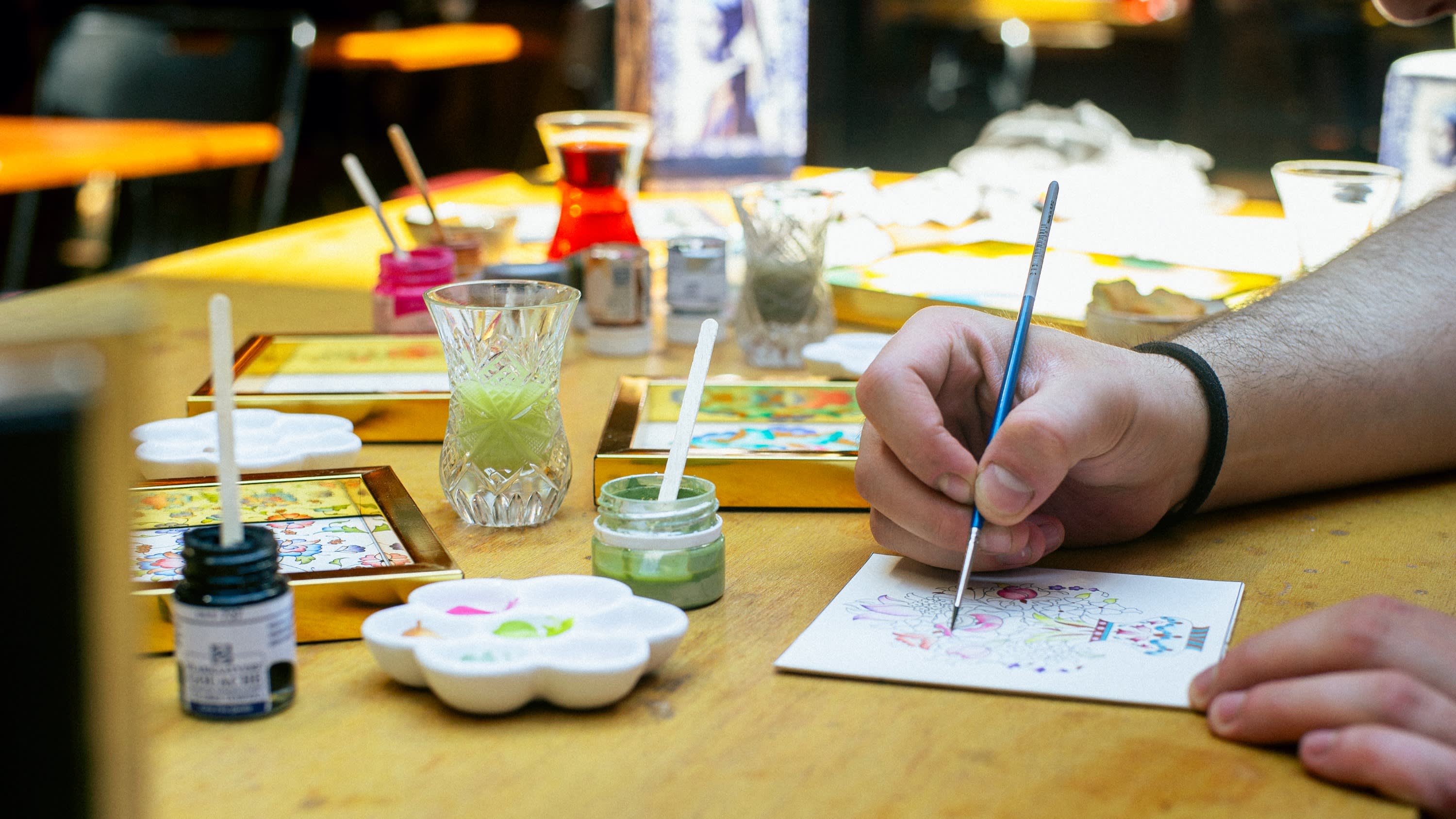 • 옛날에는 필사본, 왕실 칙령, 코란을 장식하는 데 사용되었던 전통적인 터키 채색 기법인 테지프의 세계로 들어가 보세요. 이스탄불 워크숍에서는 오스만 시대의 역사, 상징주의, 공예 뒤에 숨겨진 기술을 소개하고 채색 작품의 원본을 선보입니다. 숙련된 장인의 지도 아래 섬세한 붓놀림과 금박 적용을 연습한 다음 미리 그려진 디자인을 장식해 보세요. 준비된 종이에 천연 안료와 전통적인 방법을 사용하여 이 복잡한 예술 형식을 정의하는 레이어링과 디테일링을 탐구해 보세요. 작품이 건조되는 동안 수제 쿠키와 함께 터키 차 또는 커피를 즐겨보세요. 마지막으로 오스만 예술의 세련된 기념품이자 이스탄불의 문화유산과 독특한 연결고리인 수제 채색 작품으로 마무리됩니다.